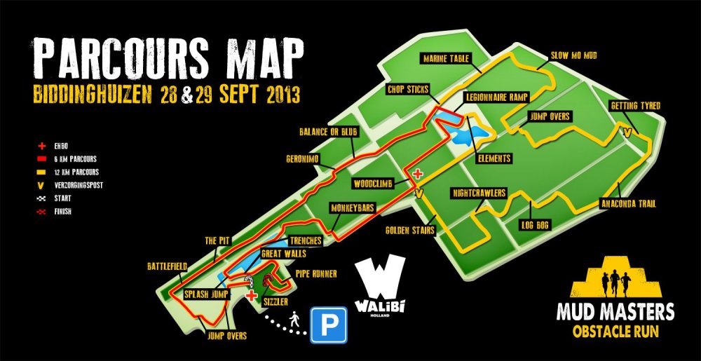 Goed. Het is nog niet eens negen uur, maar voor vandaag heb ik al voldoende spanning gehad. Met een vertraging van drie kwartier pik ik Alexander op en treffen we Gerwin bij het transferium in Hoogkerk. Gelukkig hadden we de heenreis ruim gepland en zijn we nog steeds op tijd in Biddinghuizen. We halen ons startnummer op en nemen alvast even een kijkje op het parcours. Daar ploeteren de deelnemers bij houten muurtjes en een obstakel met stroomdraden. Dit staat ons dus straks ook te wachten.