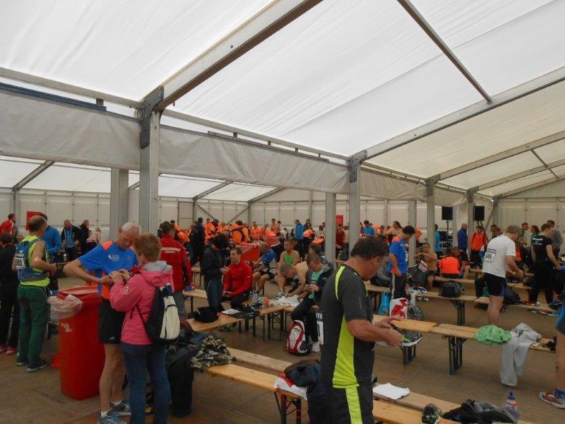 Vanaf de Coolsingel lopen we langs het stadhuis naar de Stroveer, waar een grote omkleedtent is neergezet, inclusief douches en kluisjes voor waardevolle spullen. Daar kleed ik me om en eet nog even een banaantje. Heb ik alles bij me? Check.