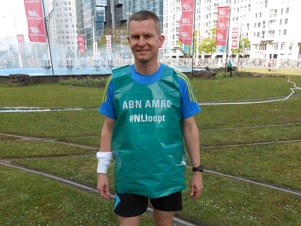 Inmiddels staat zanger Lee Towers klaar op een hoogwerker en zingt zijn You’ll Never Walk Alone over de Coolsingel. Een traditie in Rotterdam. Duizenden lopers zingen het lied uit volle borst mee, waarna met een kanonschot het startsignaal wordt gegeven. De eerste helft van de 13.500 deelnemers begint aan hun marathon. Tien minuten later zijn wij aan de beurt. Langzaam komt de enorme menigte in beweging en gaan we op weg.