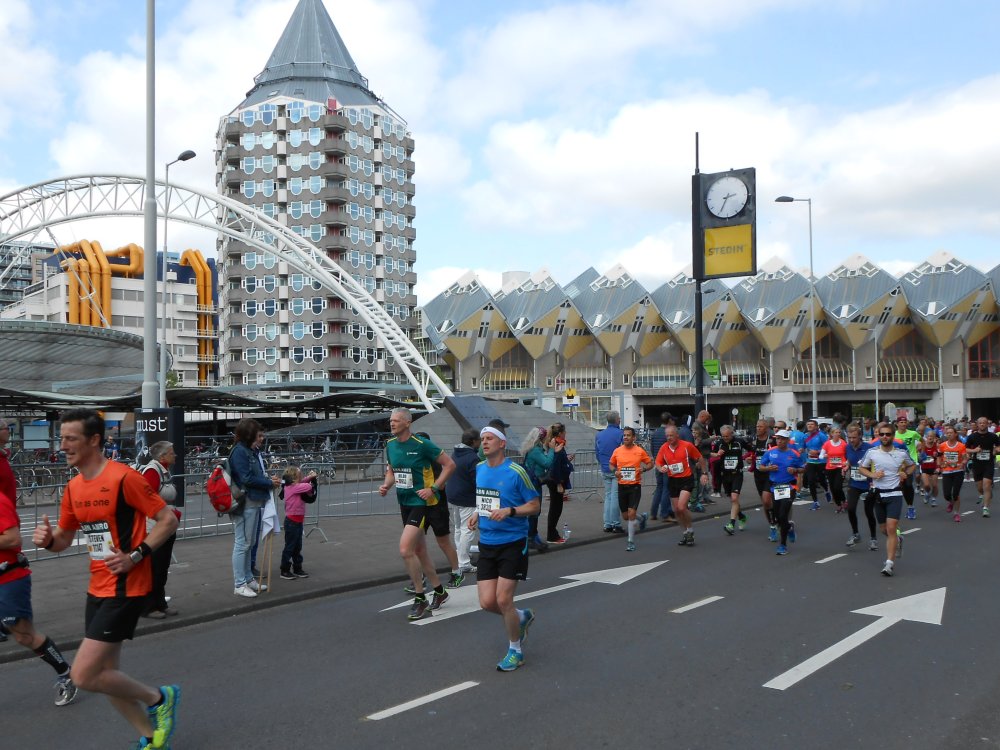 Na zo’n 26 kilometer zijn we terug bij de Erasmusbrug en steken de Maas weer over. Hier voel ik me nog redelijk goed, maar als we via de Kubuswoningen op Blaak richting het zware stuk in het Kralingse Bos gaan, begint de vermoeidheid langzaam z’n tol te eisen. Bij het 32-kilometer punt ben ik drie uur onderweg. Nog een uur voor de laatste tien kilometer, dat moet kunnen, toch? Dat is echter gemakkelijker gezegd dan gedaan, want inmiddels doen de beenspieren behoorlijk pijn. M’n tempo daalt en bij de drinkposten ga ik steeds even wandelen om de benen te ontspannen. Dat helpt. Bovendien worden de lopers hier over het dode punt geholpen door de aanmoedigingen van het massaal toegestroomde publiek langs de kant. Wat een enthousiasme en wat een positieve sfeer!