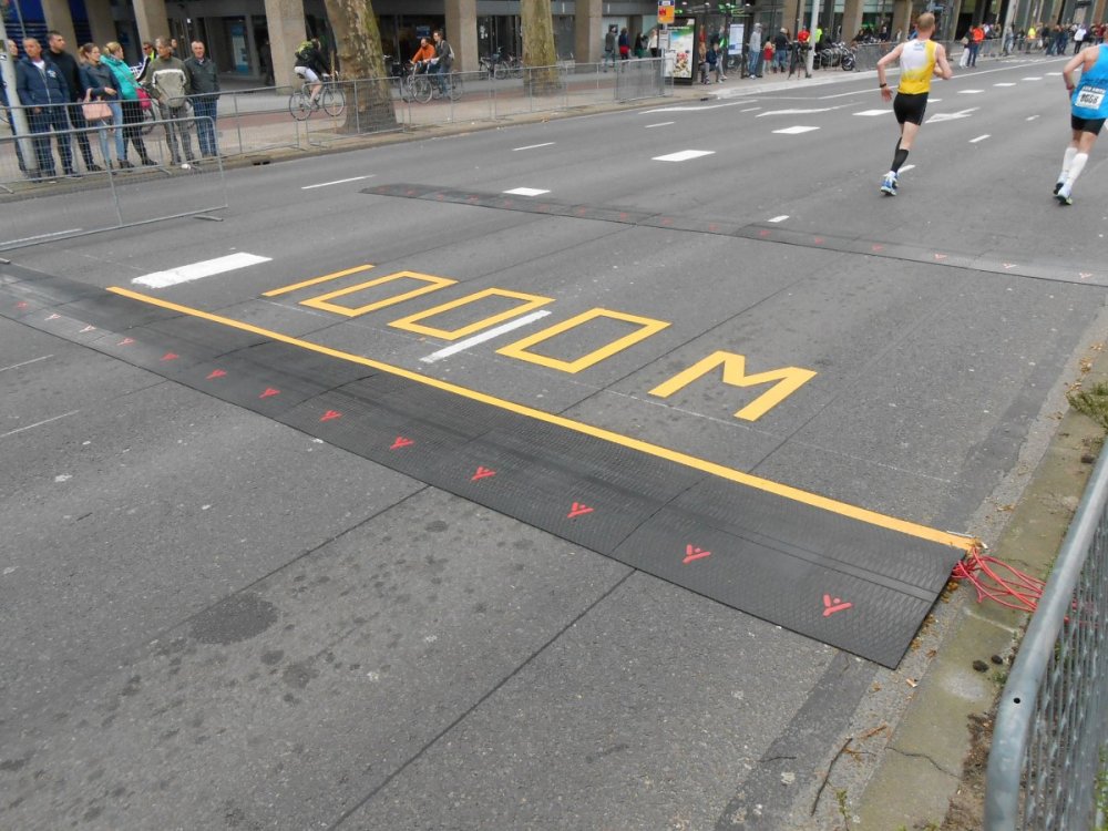 In de slotfase tel ik in m’n hoofd de kilometers af en blijf me focussen op m’n tempo. Daardoor mis ik een paar kilometerbordjes en aangezien m’n horloge ook niet helemaal de juiste afstand aangeeft, is het een beetje gokken hoever het nu nog naar de streep is. Maar net na het passeren van de Kubuswoningen zie ik ineens de mat voor de laatste kilometer liggen. Dat geeft me een enorme boost, want ik ben dichter bij de streep dan ik dacht. Bovendien zie ik dat ik nu 3:53 uur onderweg ben. Een tijd onder de vier uur is dus goed mogelijk, want ik heb nog zeven minuten voor de laatste kilometer.