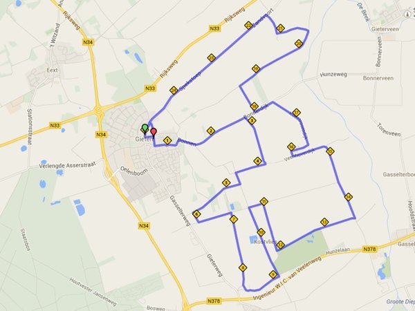 We maken een klein rondje door het dorp en gaan op weg naar het gebied tussen Gasselte en Gieterveen. Via onder meer de Bonnerdijk en de Grensweg slingeren we zuidwaarts richting Gasselte. Na zo’n negen kilometer maken we een uitstapje via Kostvlies en gaan uiteindelijk in de richting van Gasselternijveen. Aan het einde van de Nieuwe Dijk slaan we linksaf en slingeren ongeveer acht kilometer in noordelijke richting. Via de Spekstoep lopen we de laatste vier kilometer in een rechte lijn naar de finish.