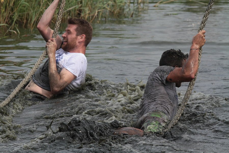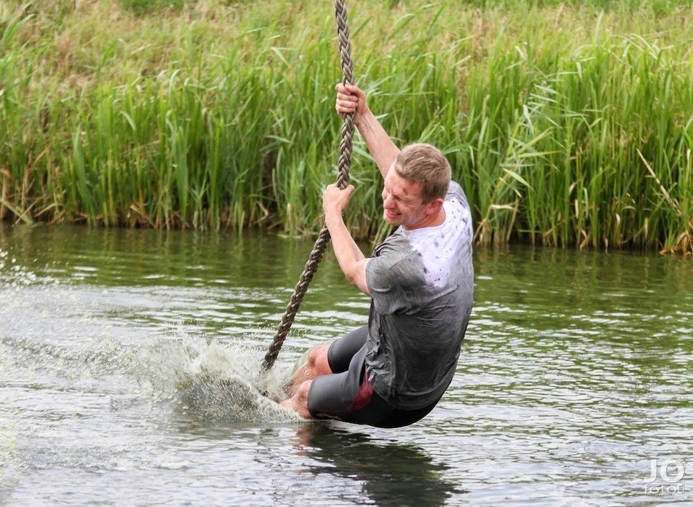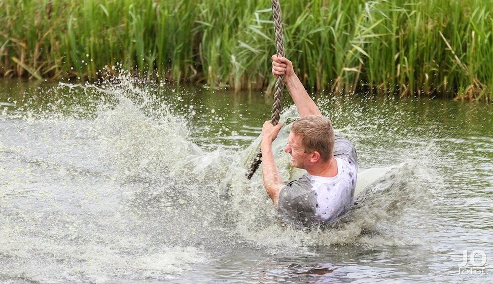 Het parcours vervolgt door een brede sloot, waarin ook planten met stekels drijven. Eenmaal uit de sloot wacht het tofste onderdeel van deze race: hangend aan een touw word je door een heftruck het water in gesleept. Een prachtig, origineel element!