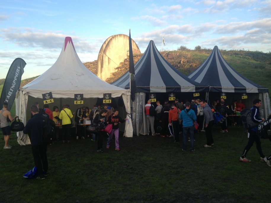 Onderweg naar de inschrijfbalie komen we langs een deel van het parcours. Zo zien we de bekende stroomdraadjes al weer hangen, brrr. Het ophalen van ons startbewijs, een Strong Viking-tattoo ons startnummer, verloopt erg soepel en ook op het binnenterrein is alles prima voor elkaar, met de nodige eet- en drinktentjes, een DJ die niet hinderlijk aanwezig is en kleedruimte binnen bij Snowplanet. Ook het inleveren van de tassen verloopt soepel en zelfs het weer werkt volop mee met een lekker zonnetje. We lopen nog even een kwartiertje rond op het terrein en gaan dan naar het startvak.