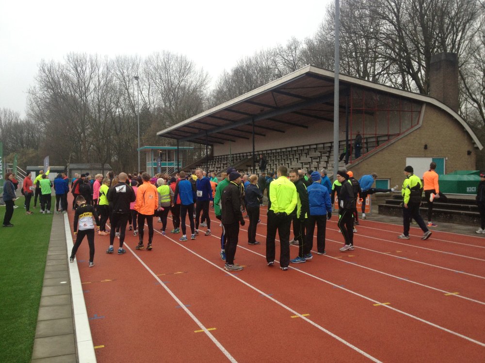 Na het Herewegviaduct loop ik via de Rabenhauptstraat en de Parkweg in een lange rechte lijn naar het Stadspark. In de kantine van Groningen Atletiek is het al gezellig druk. Ik haal m’n startnummer op en praat even bij met mijn schoonvader Niko, die vandaag wederom vrijwilliger is bij de loop. Hoewel ik natuurlijk al opgewarmd ben, loop ik nog een paar rondjes op de baan en ga dan naar de start. Er zijn zo’n honderdzeventig hardlopers aanwezig.