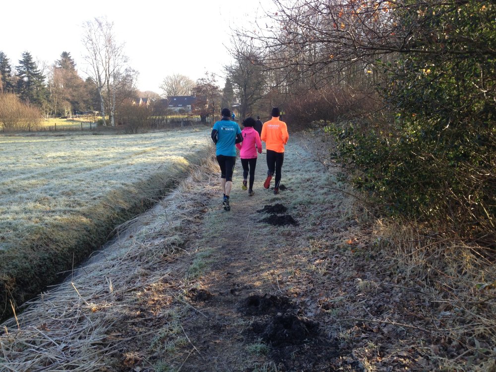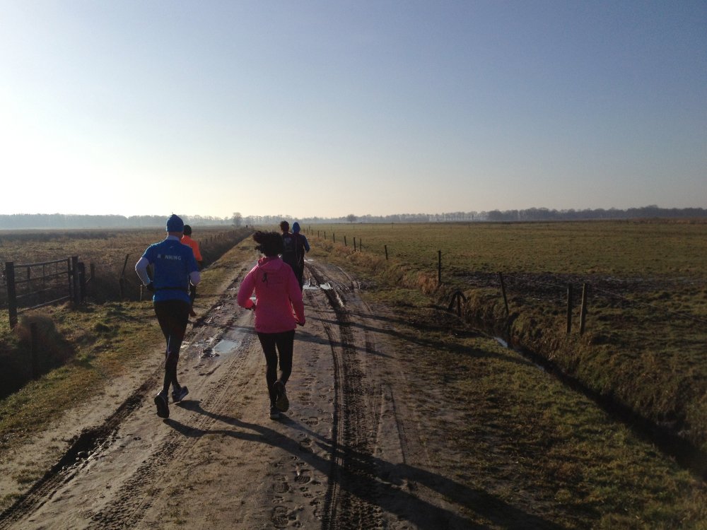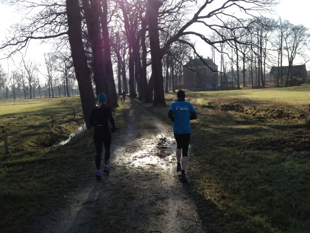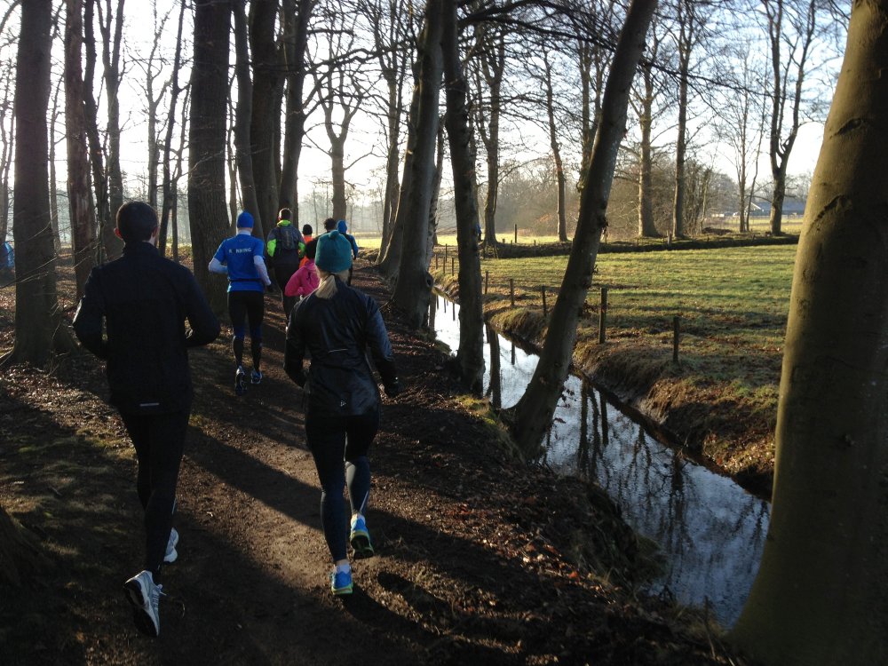 Het is vandaag heerlijk loopweer. Weliswaar fris, maar het zonnetje schijnt. We gaan met z’n tienen van start. Vanaf het hotel slaan we rechtsaf en belanden via een onverhard paadje op de Onlandseweg. Iets verderop steken we met een glibberig bruggetje een kleine sloot over en rennen door een strookje bos. Op de Verlengde Boterdijk slaan we net voor de brug linksaf en lopen over een zandpad een heel stuk parallel aan het Eelderdiep. Het pad is drassig en hier en daar moeten we om de plassen heen slalommen.