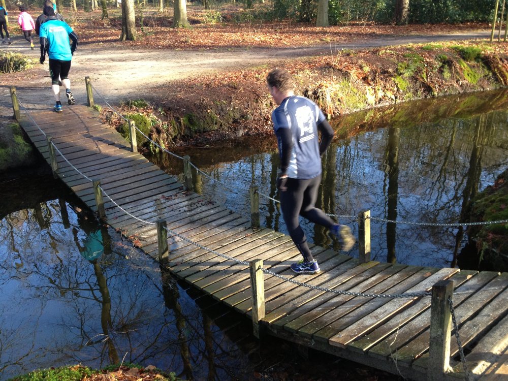 Na zo’n vijf kilometer belanden we op het fraaie bosrijke landgoed De Braak. Hier beklimmen we een heuveltje en steken met een houten hangbrug een sloot over. Op naar de Hoofdweg, want het is tijd voor een blokje looptechniek door Jerzy. Dribbelen, hakken-bil, knieheffen, het komt allemaal voorbij in diverse variaties. Na de oefeningen maken we tóch nog een kleine uitstap langs het Friescheveen en lopen dan weer terug naar het Familiehotel.