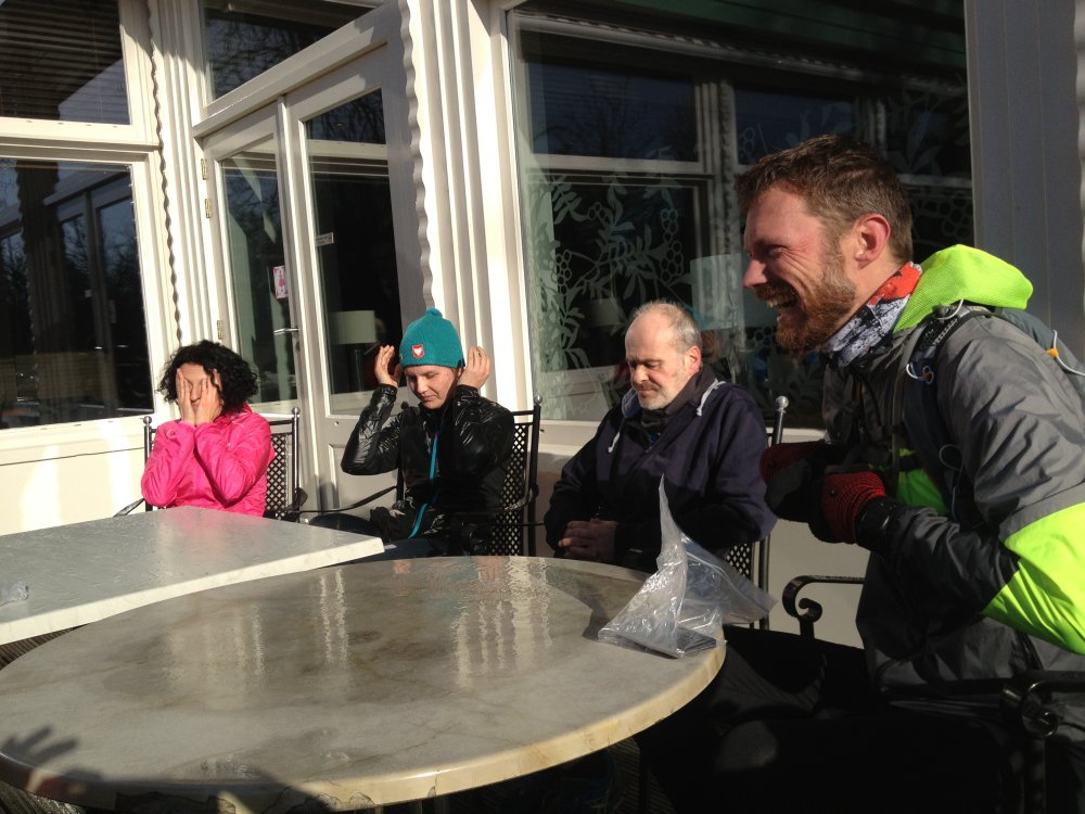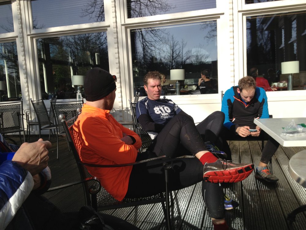 In ongeveer een uur hebben we een prachtig rondje van 8,5 kilometer afgelegd. Nu maken we ons op voor een welverdiend kopje koffie. En die drinken we vandaag buiten, want in het zonnetje is dat prima te doen. Het eerste terrasje van dit jaar! Een mooie afsluiter van een heerlijk hardloopochtendje.
