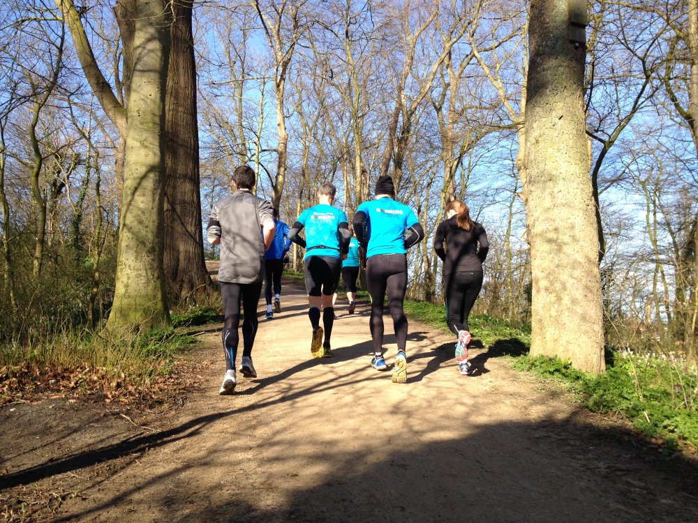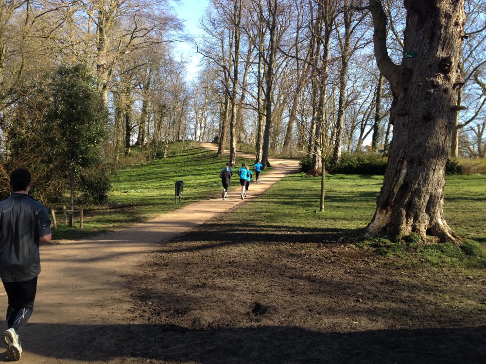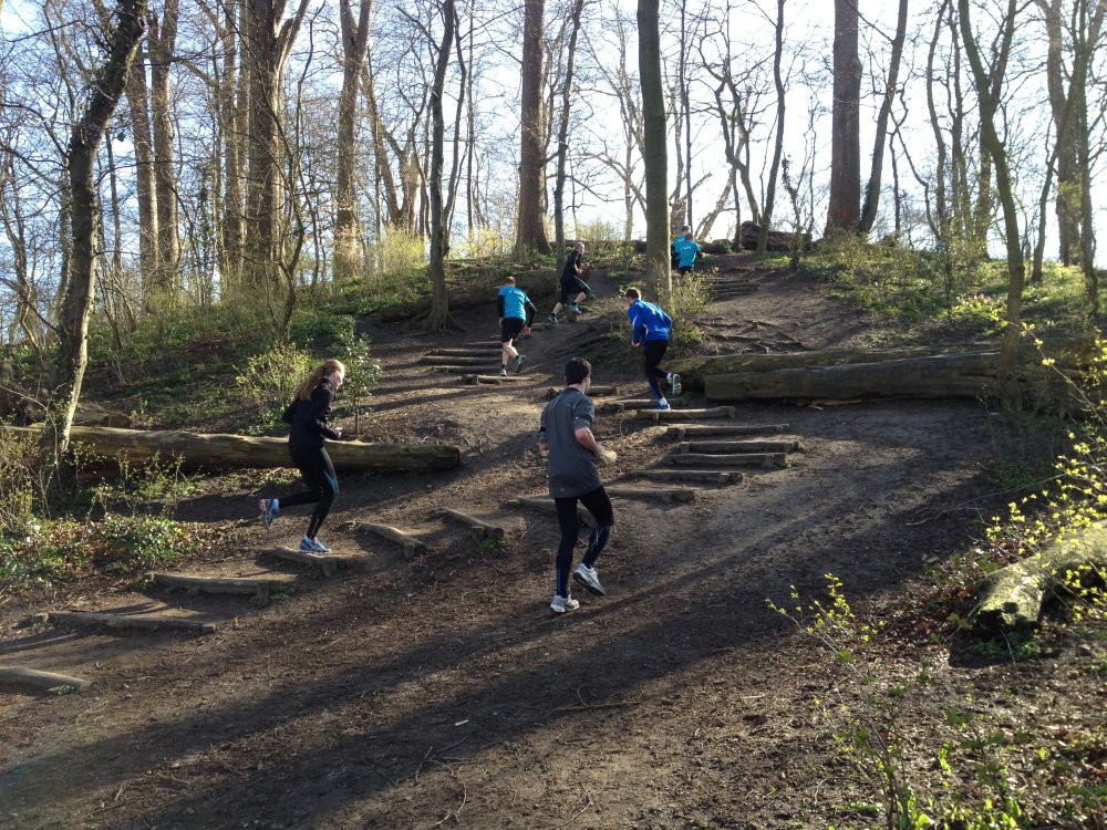 Iets verderop geeft Jerzy ons het gebruikelijke blokje loopscholing. De oefeningen vallen lang niet altijd mee. Soms moeten we echt goed nadenken over onze coördinatie en blijkt het net te moeilijk om alles in de juiste volgorde uit te voeren. Maar iedereen doet zijn best en het is een welkome break van ons rondje. We hebben nog niet alle hellingen in het plantsoen ‘afgetikt’, dus dat doen we in het tweede deel van ons hardlooprondje. De beruchte heuvel bij de muziekkoepel beklimmen we zelfs twee keer.