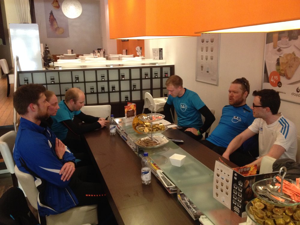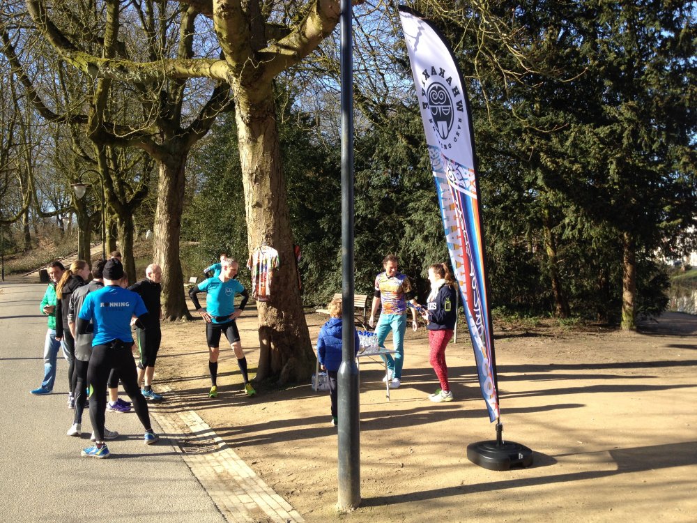 Na een kwartiertje in het plantsoen pauzeren we even bij de verzorgingspost van het rebelse Groningse hardloopmerk Whakakeke, dat onlangs is gelanceerd door Running Coffee-deelnemer Job. Samen met Menno deelt hij bij zijn tafeltje sportdrank, water en bananen uit en laat hij de hardlopers in het plantsoen kennismaken met dit nieuwe merk. Een spontane en sympathieke actie, waar wij uiteraard graag gebruik van maken. Inmiddels is het ook een paar graden warmer geworden. Prima loopweer.