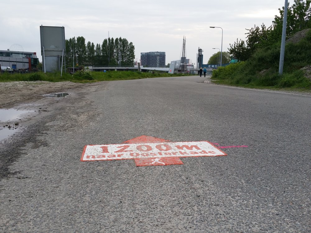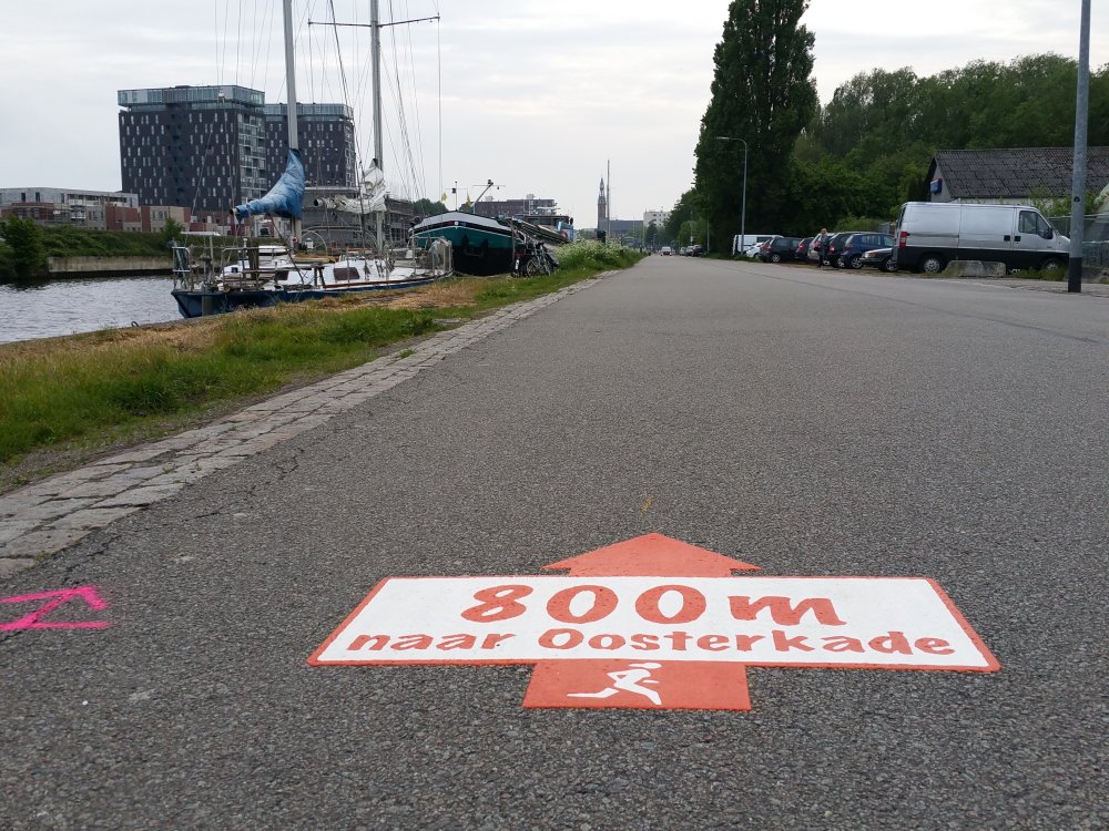 Op weg naar de Nacht van Groningen besluit ik dit nieuwste route meteen te lopen. Lastig is het traject niet. Het is namelijk één rechte lijn van 1320 meter langs het kanaal en hoogteverschil is er ook niet. Maar onderweg valt wél een heleboel te zien. Mijn startpunt achter de Praxis bij het Damsterdiep is formeel het eindpunt, maar omdat de diverse afstandsmarkeringen naar beide kanten wijzen, maakt het eigenlijk helemaal niet uit aan welke kant je begint. En je kunt deze route dus ook heen en terug lopen. Met markeringen om de vierhonderd meter is het zeer geschikt voor intervallen.