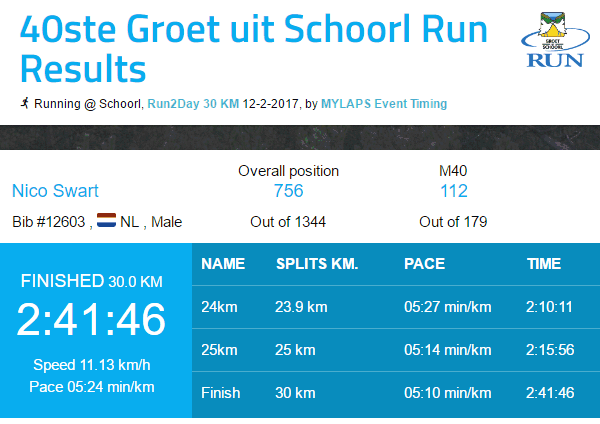 Na zo’n 28 kilometer zijn we weer in Groet en betreden de Oorsprongweg voor de derde keer. Nog zo’n anderhalve kilometer tot de Klimduin en dan linksaf naar de finish. Uiteindelijk passeer ik de streep na 2 uur en 41 minuten. Met die tijd ben ik zeer tevreden en nog belangrijker: ik heb lekker gelopen. Dat biedt hoop voor de Sallandtrail (50 kilometer) in maart en uiteindelijk de Zestig van Texel in april.