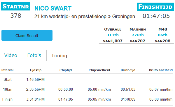 Een eindsprint zit er niet meer in, maar ik heb lekker gelopen en met mijn 1:47 uur ben ik dik tevreden. Ik ben zowaar zelfs acht minuten sneller dan vorig jaar en afgaande op de statistieken heb ik best constant gelopen.
