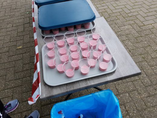 Met zo’n vier kilometer en wat hoogtemeters in de benen bereiken we de Dirty Wheels. Hier sjouwen en slalommen we bijna een kilometer lang met een autoband in het heuvelachtige landschap. Ineens schreeuwt iemand “Zicke zacke, zicke zacke!” en de rest van de deelnemers antwoordt hem met “Hoi hoi hoi!” 😀