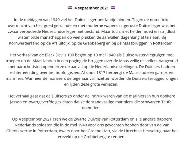 De Zwarte Duivels werd de bijnaam van de Rotterdamse mariniers, die in mei 1940 dagenlang dapper streden om de Maasbruggen. Vanwege het standvastige verzet noemden de Duitsers hun tegenstanders in de donkere uniformen ‘die schwarzen Teufel’. Op de website van de organisatie staat het achtergrondverhaal mooi omschreven: