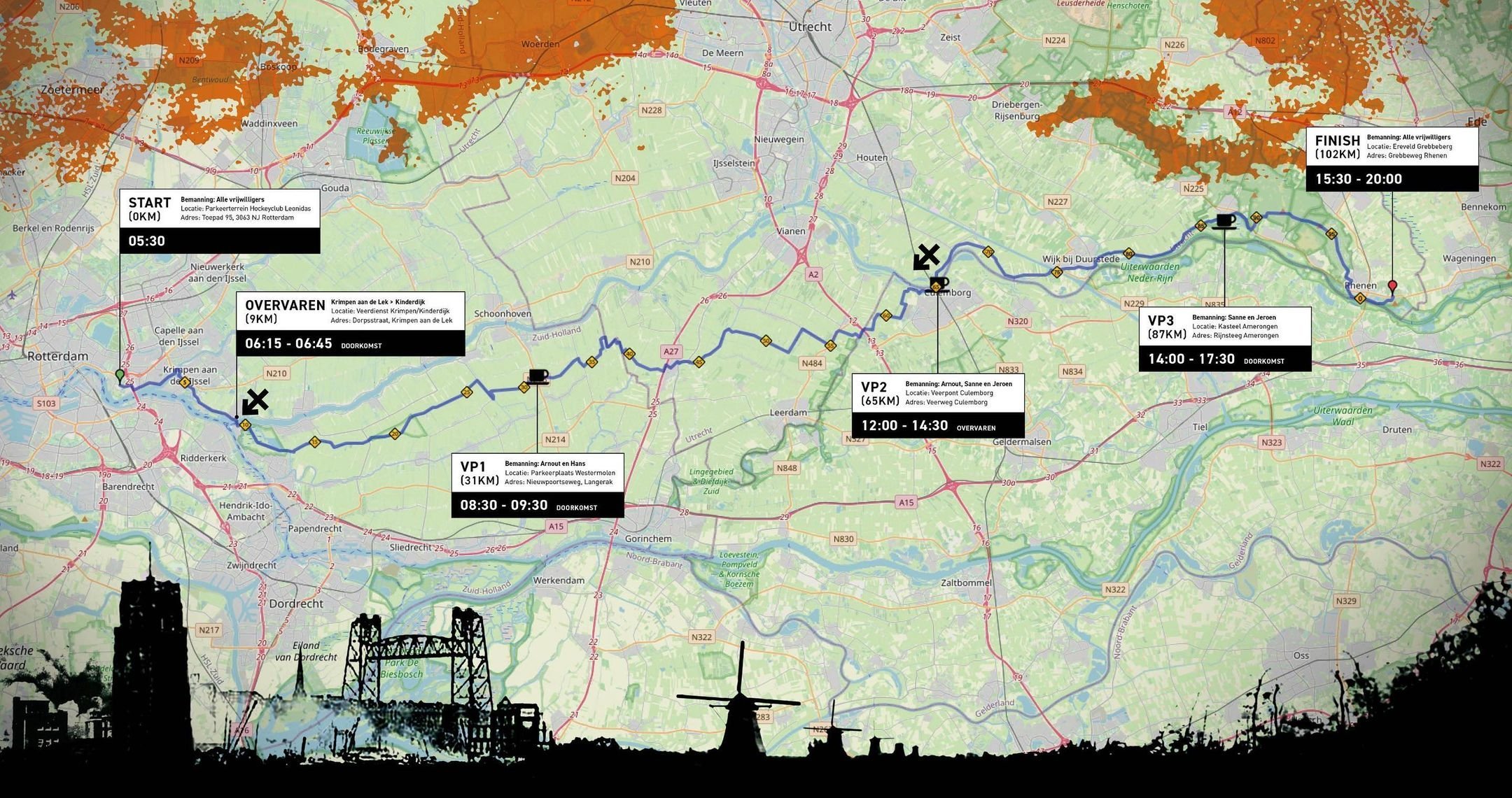 De loop begint bij de basis van de Rotterdamse mariniers: de Van Ghentkazerne. Grofweg langs de Lek en de Nederrijn rennen we naar het Militair Ereveld Grebbeberg, de laatste rustplaats voor ruim 850 militairen, die tijdens de Tweede Wereldoorlog sneuvelden. Onderweg zijn er drie verzorgingsposten (VP’s) en worden we twee keer met een pontje naar de andere kant van de rivier gebracht.