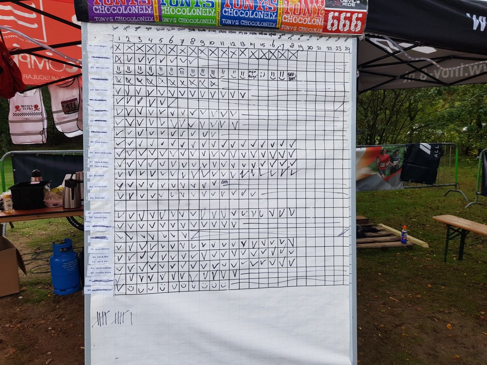 De eerste rondjes in het ochtendlicht gaan vrij aardig. Het is weer even wennen aan de smallere paadjes, maar de dagroute is een stuk afwisselender dan de nachtroute. Al snel staan er op het bord 18 vinkjes achter mijn naam. Driekwart van de race zit erop.