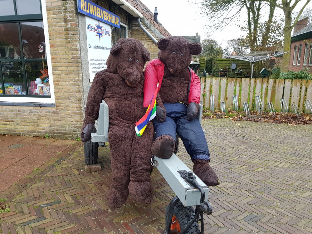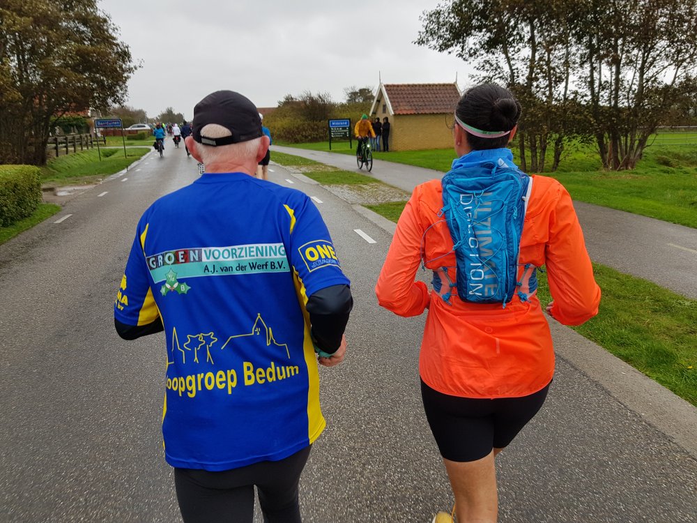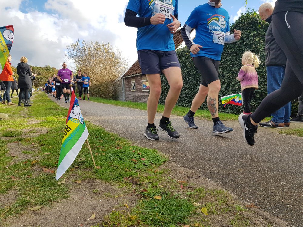 Inmiddels lopen we al een stukje samen met Peter, die zijn 18e hele Berenloop rent. Als eerbetoon aan zijn in juli overleden loopmaatje Dick loopt hij in diens loopshirt. Ook draagt hij het beertje van de fervente Berenloper de hele route met zich mee. Na afloop krijgt Dick’s beertje een vaste plek op Terschelling. Een prachtig eerbetoon!