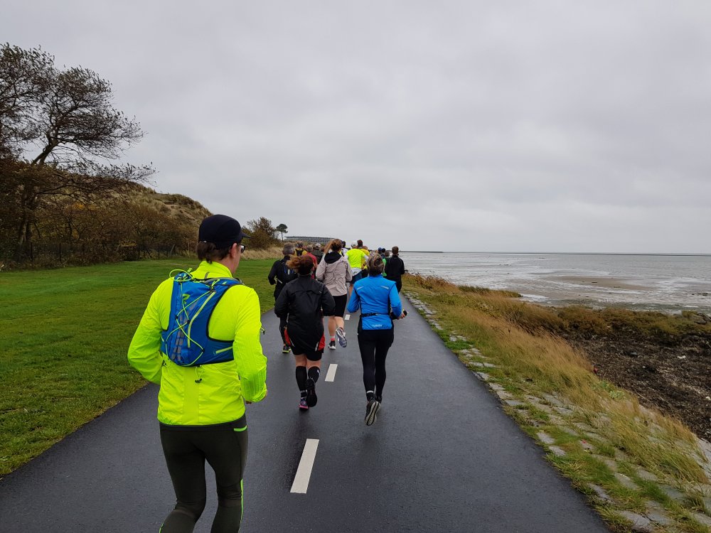 Om 12 uur klinkt het startsignaal en gaan we op pad. Over de Zwarteweg en langs de haven rennen we via de Dellewal naar de Hoofdweg. De lucht is weliswaar grauw, maar voorlopig is het gelukkig droog.