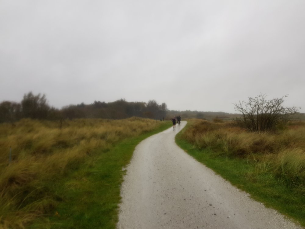 Met zo’n vijftien kilometer in de benen zijn we in natuurreservaat de Boschplaat. Hier begint het flink te regenen en lopen we ook stukken tegen de harde wind in. Al snel ben ik doorweekt en ook wel een tikkie verkleumd. In beweging blijven is de beste remedie. Zeven kilometer lang strijden we hier tegen de elementen. In de luwte van het Hoornsebos kunnen we eventjes op adem komen.