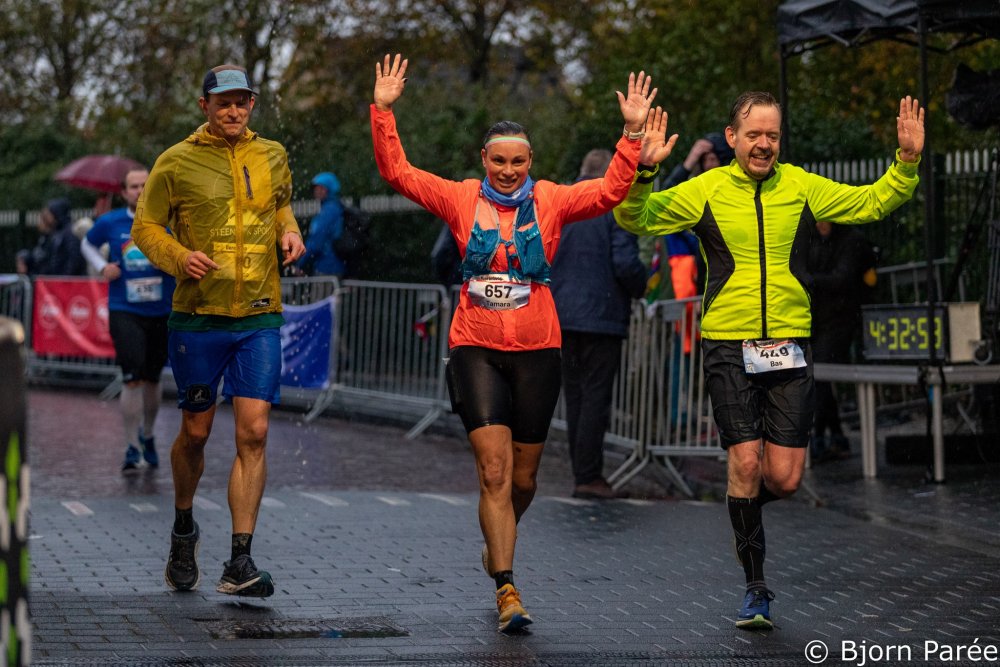 Na ruim 4,5 uur komen we met z’n drieën gezamenlijk over de streep. Doorweekt en verkleumd, maar we hebben het geflikt!
