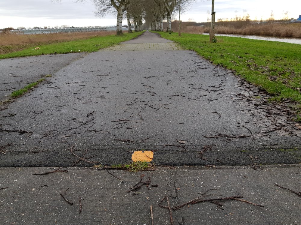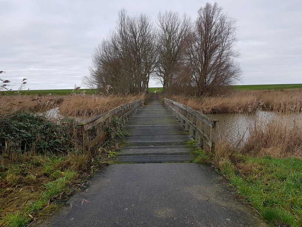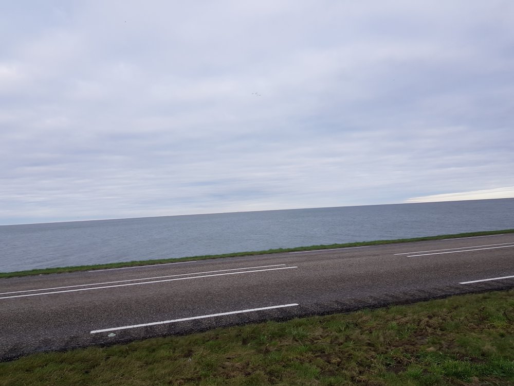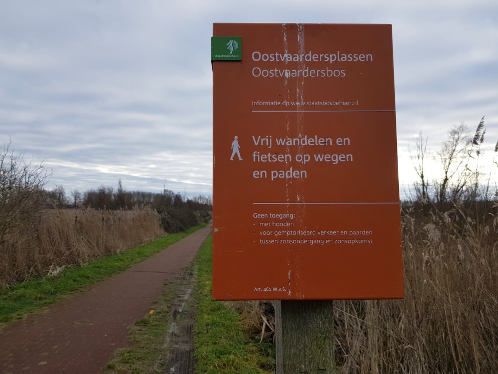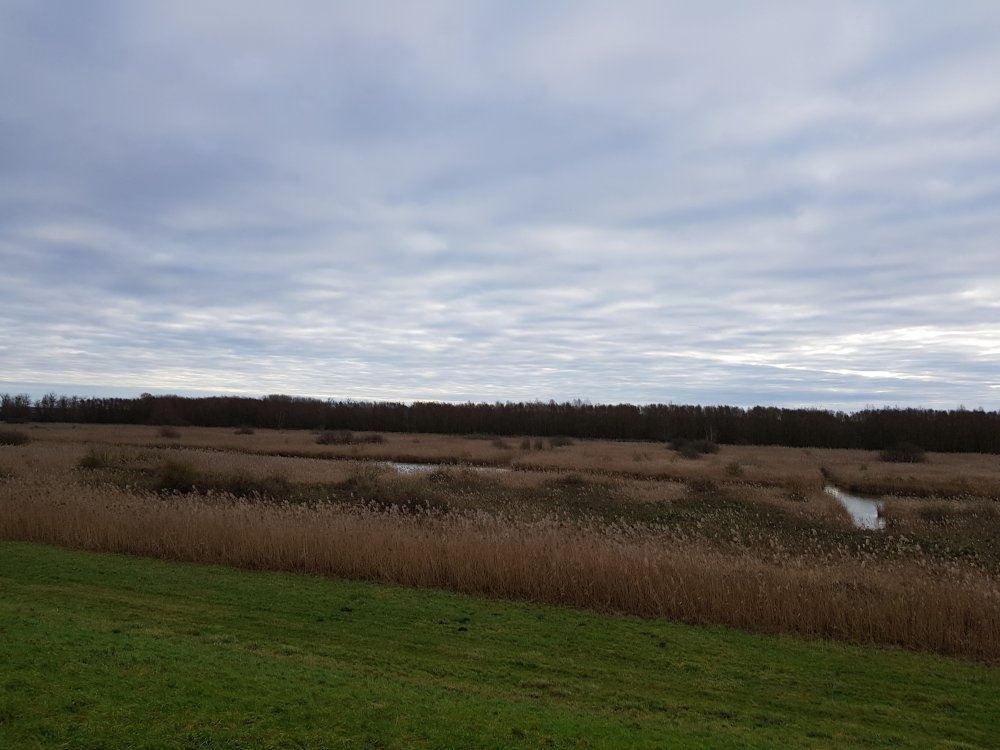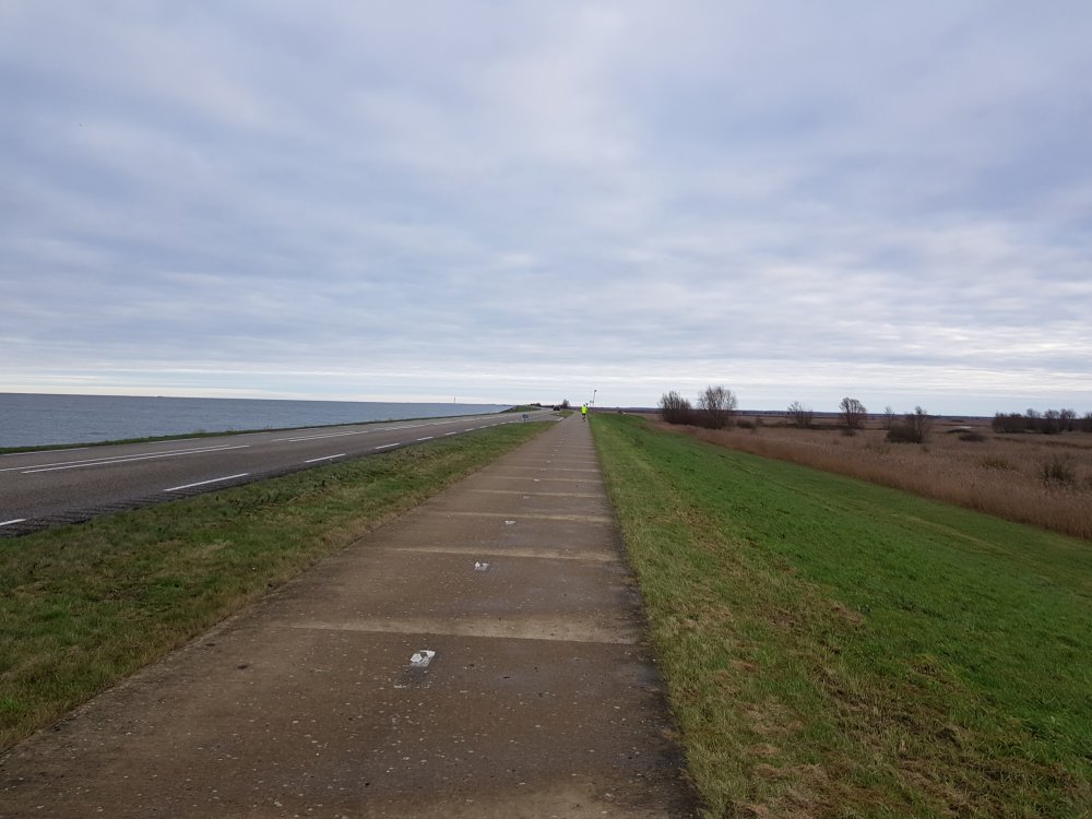 We lopen nu twee kilometer in een kaarsrechte lijn naar de Oostvaardersdijk. Op de dijk kijken we uit over het Markermeer en de Oostvaarderszone. Eenmaal weer afgedaald van de dijk is het nog zo’n zeshonderd meter terug naar de parkeerplaats. Toch best een leuk rondje.