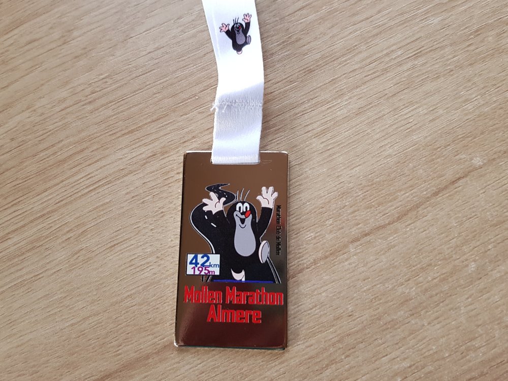 Na bijna 4 uur en 11 minuten kom ik over de streep. Ondanks de lastige laatste kilometers valt die tijd me niet tegen, maar nog belangrijker: ik heb over het algemeen lekker gelopen. Nog even een finishselfie met de geinige Mollenmedaille en dan stap ik weer in de auto. Marathon nummer 99 in de pocket, op naar nummer 100!