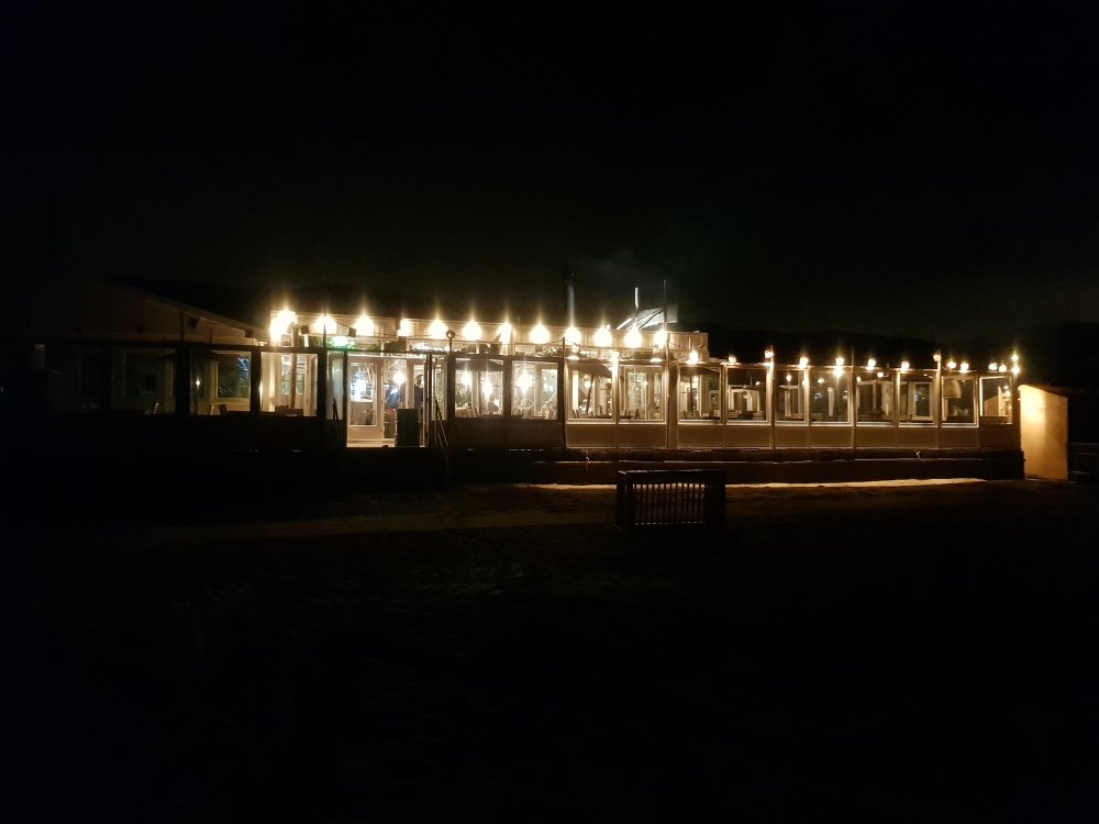 Het laatste stuk naar Castricum aan Zee is lastig. Het strand is smal en niet altijd vlak. Toch blijven we lekker in beweging. Na zo’n 6,5 zien we het verlichte eindpunt van deze tocht: strandpaviljoen De Deining. Onze eindtijd wordt genoteerd en Ketura hangt ons een welverdiende medaille om de nek. Daarna komen we even rustig bij met eten, drinken en warmte…
