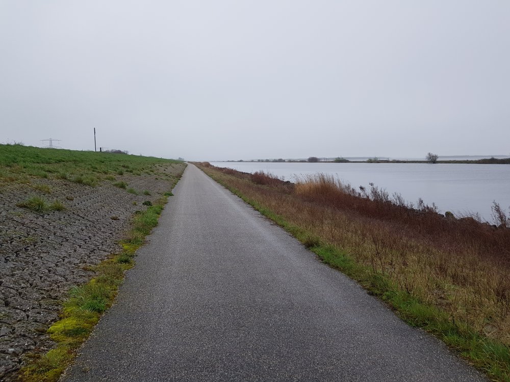 Het stuk langs de oevers van het Vollenhovermeer is pittig door de regen en de wind tegen. Ik ben dan ook blij als ik de Blokzijlerweg bereik. De vreugde is echter van korte duur.