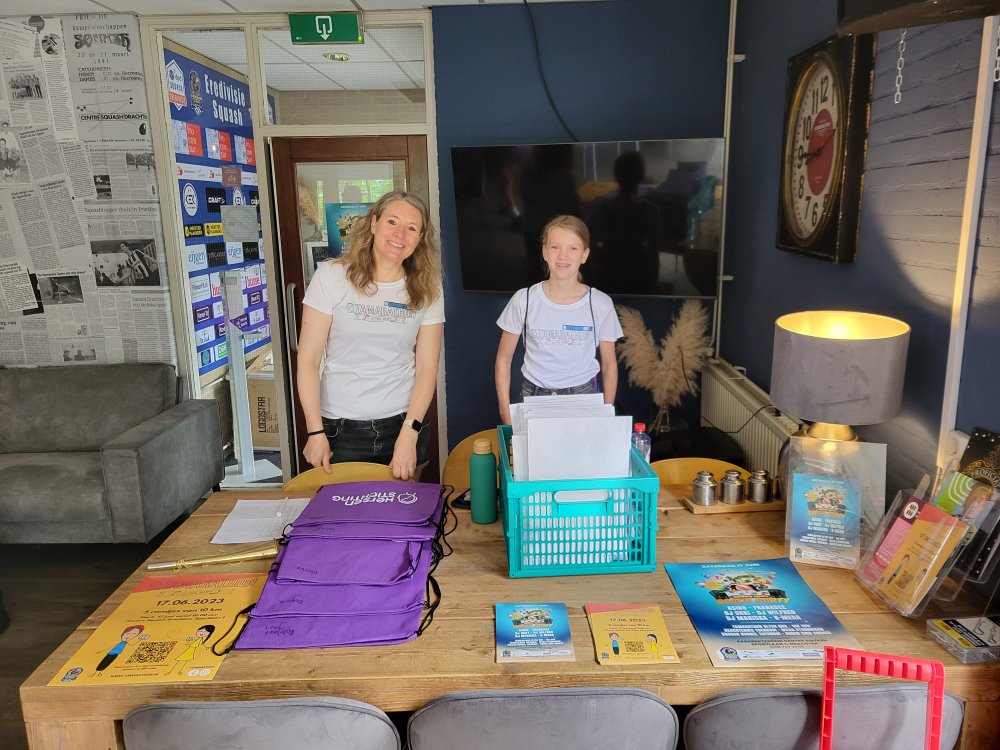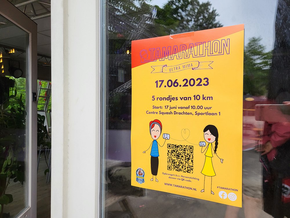 Op zaterdagochtend rij ik samen met Bas naar Centre Squash Drachten, de uitvalsbasis. Het squashcentrum pakt zelfs groot uit met een zomerse beachparty om zoveel mogelijk publiek te trekken. Binnen halen we ons startnummer op en spelden dat op het fraaie deelnemersshirt. Uiteraard spreken we ook Tamara eventjes. Ze is nerveus of maakt zich zorgen of alles wel goedkomt. Natuurlijk komt alles goed, want ze heeft allemaal enthousiaste vrijwilligers opgetrommeld, die alles in goede banen leiden.