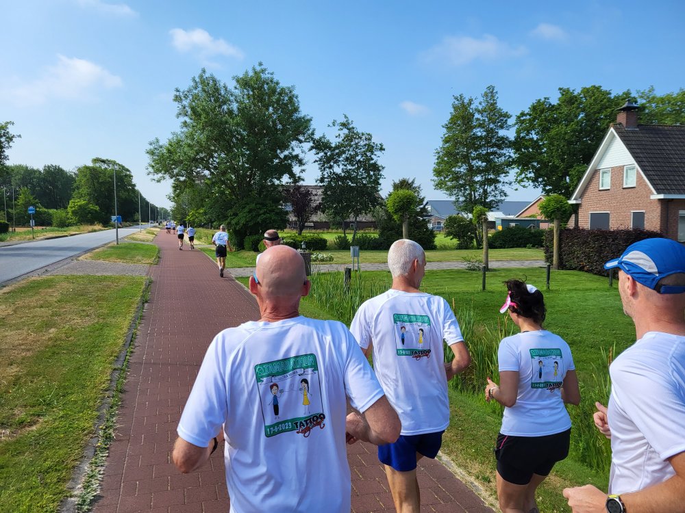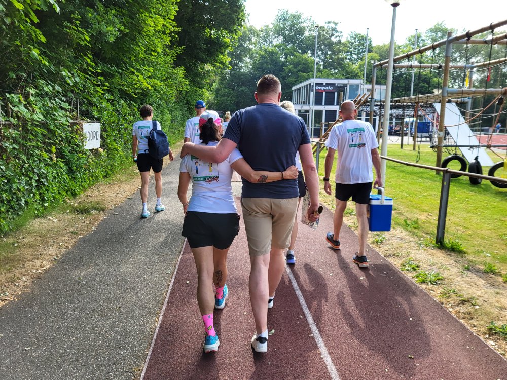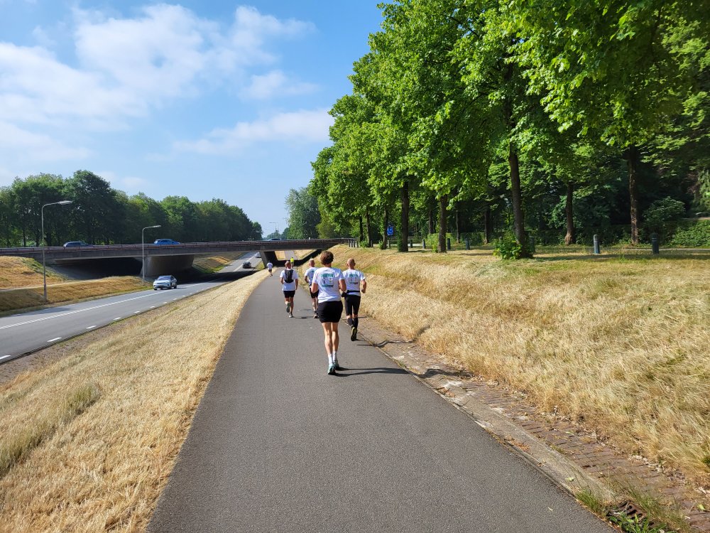 De eerste twee rondjes loop ik samen met Bas. De kilometers vliegen voorbij, al begint het wel warm te worden.