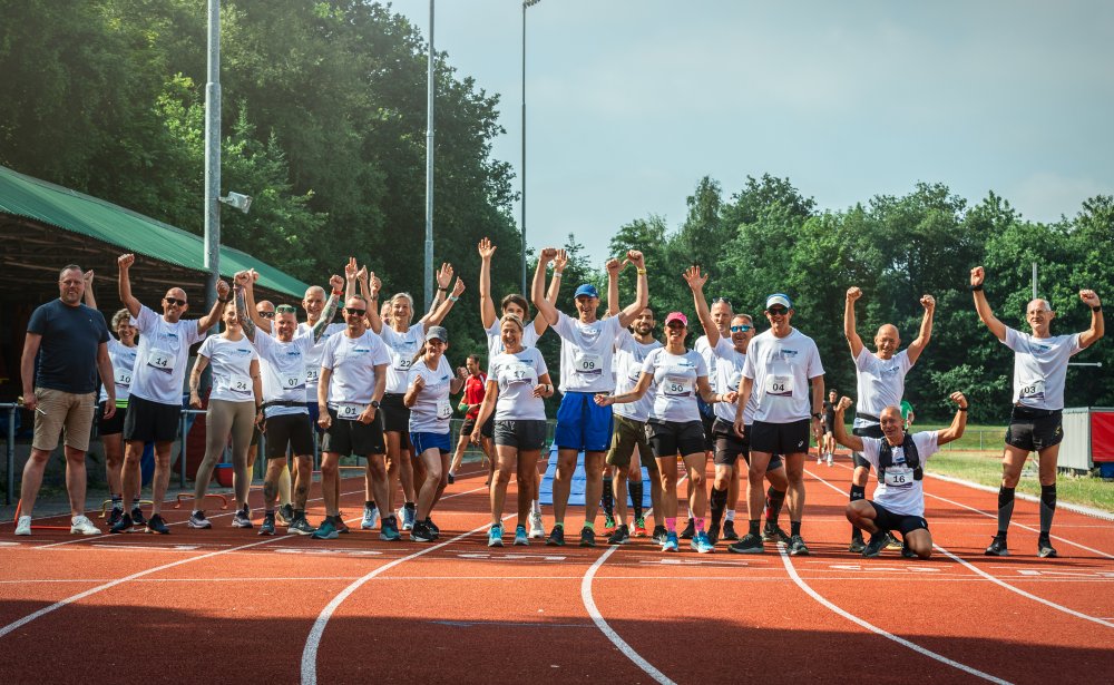 Iets voor tienen lopen we gezamenlijk naar de atletiekbaan van AV Impala. Tamara loopt samen met Jelle arm in arm naar de atletiekbaan. Jelle is de man van Maaike. Hij geeft het startsignaal voor deze TaMarathon ter ere van Maaike.
