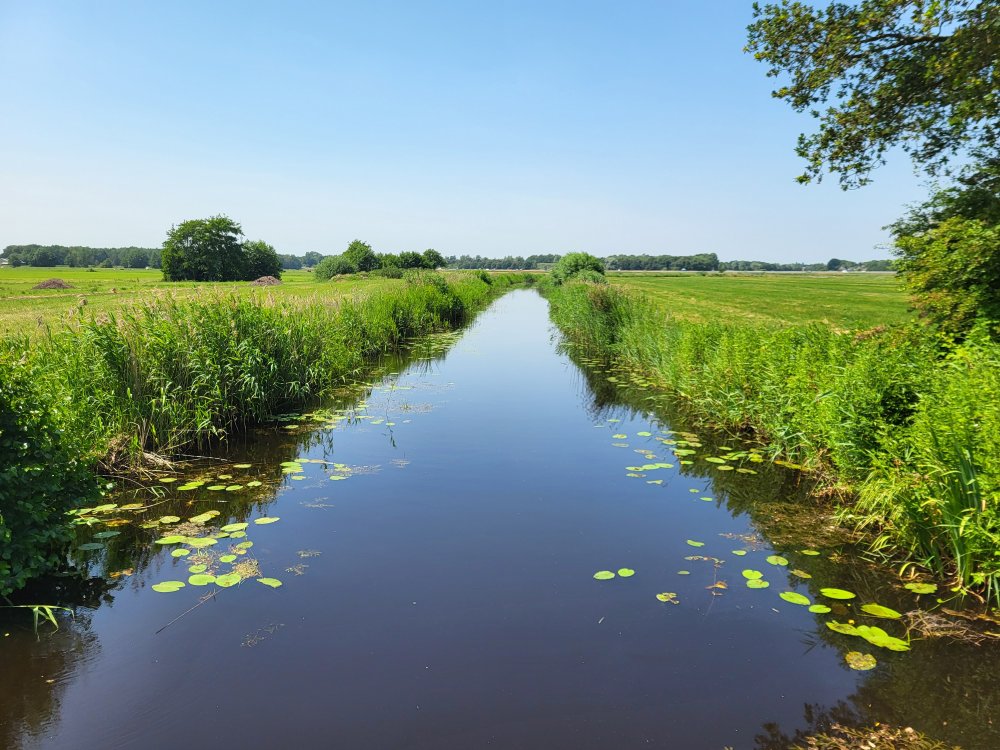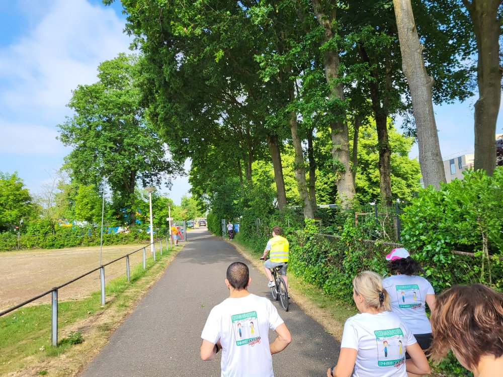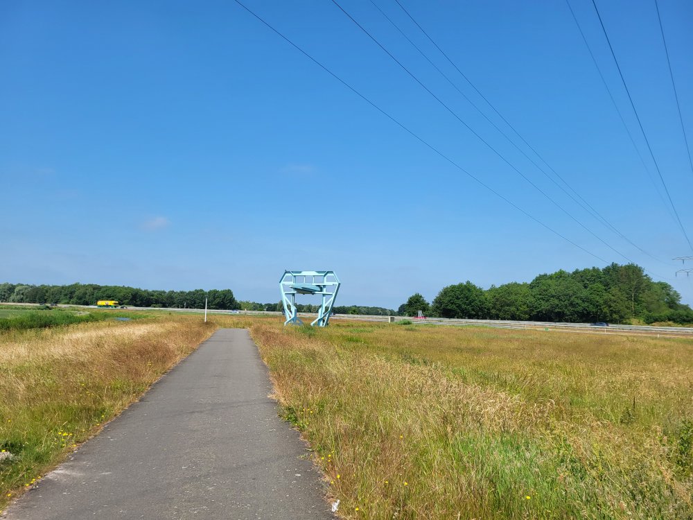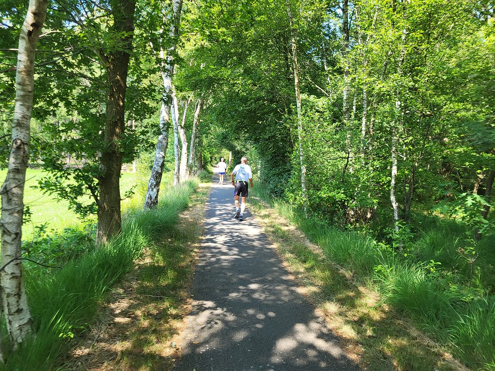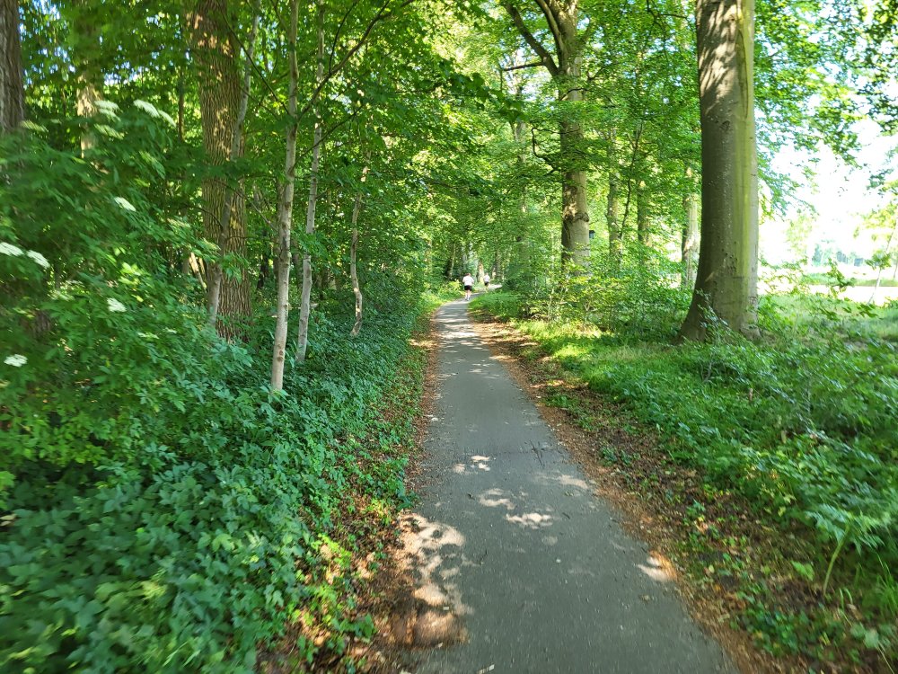 Met zo’n vijf kilometer in de benen duiken we gelukkig ook de schaduw in. Dit deel van zo’n drie kilometer tot de A7 is prachtig en grotendeels beschut door bomen. Halverwege kunnen we bovendien even bijtanken bij de verzorgingspost.