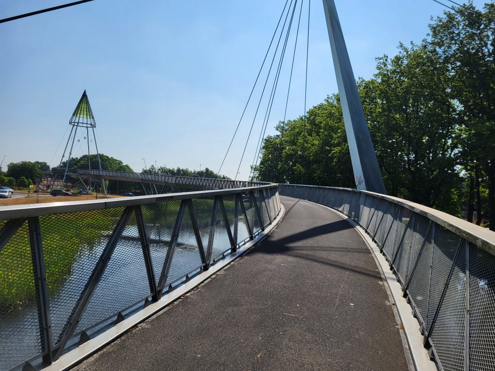 Via de fietstunnel onder de A7 lopen we Drachten weer binnen. Op fietsbrug De Slinger kwellen we nog even onze kuiten en rennen dan terug naar de atletiekbaan. Ook daar kunnen we weer wat eten en drinken. Dat is vandaag hard nodig.