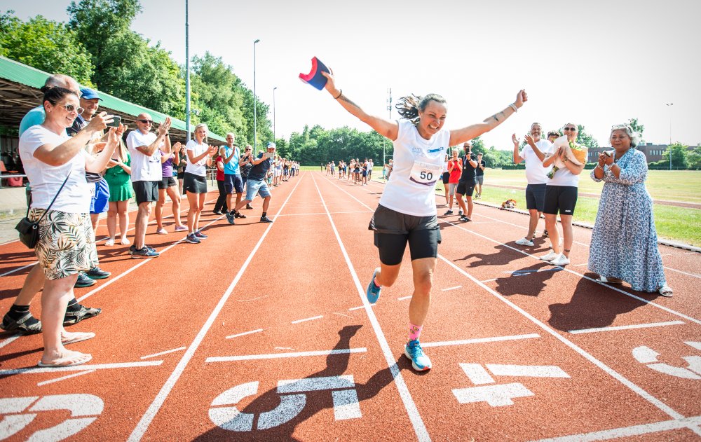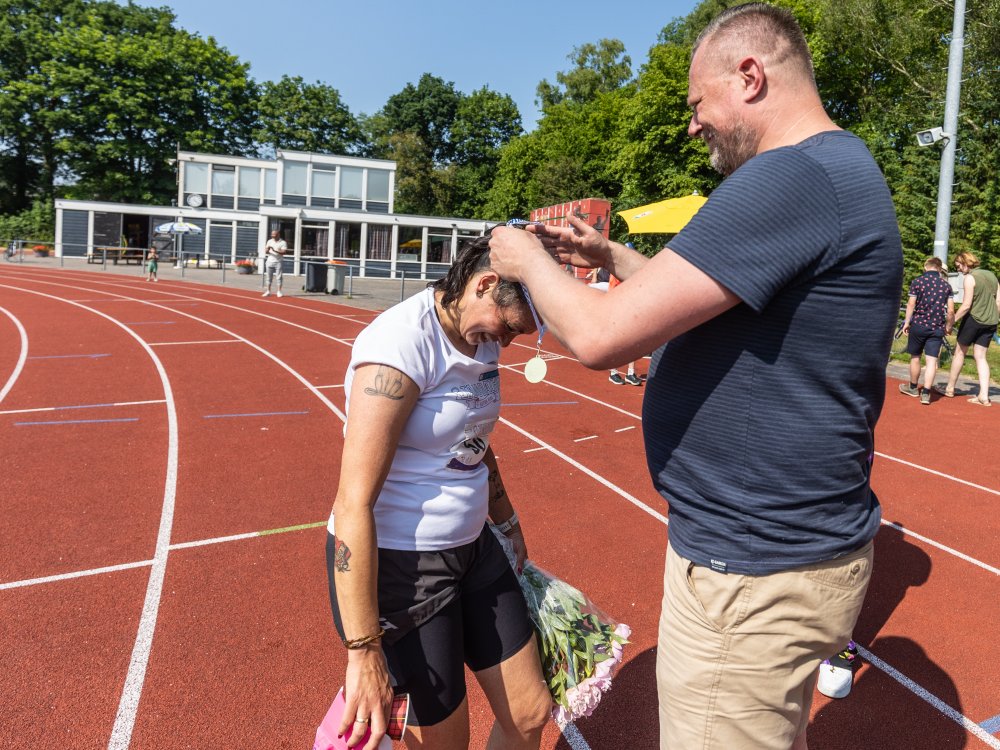 Maar de mooiste finish van de dag is natuurlijk die van Tamara. Gelukkig ben ik net op tijd voor haar laatste meters en ik neem plaats in de erehaag. Met luid applaus komt Tamara lachend en huilend over de streep. Van Jelle ontvangt ze haar medaille. Wat een prestatie heeft ze geleverd! Niet alleen met het volbrengen van deze ultraloop, maar ook met het organiseren van alles eromheen. Superknap gedaan, Tamara!