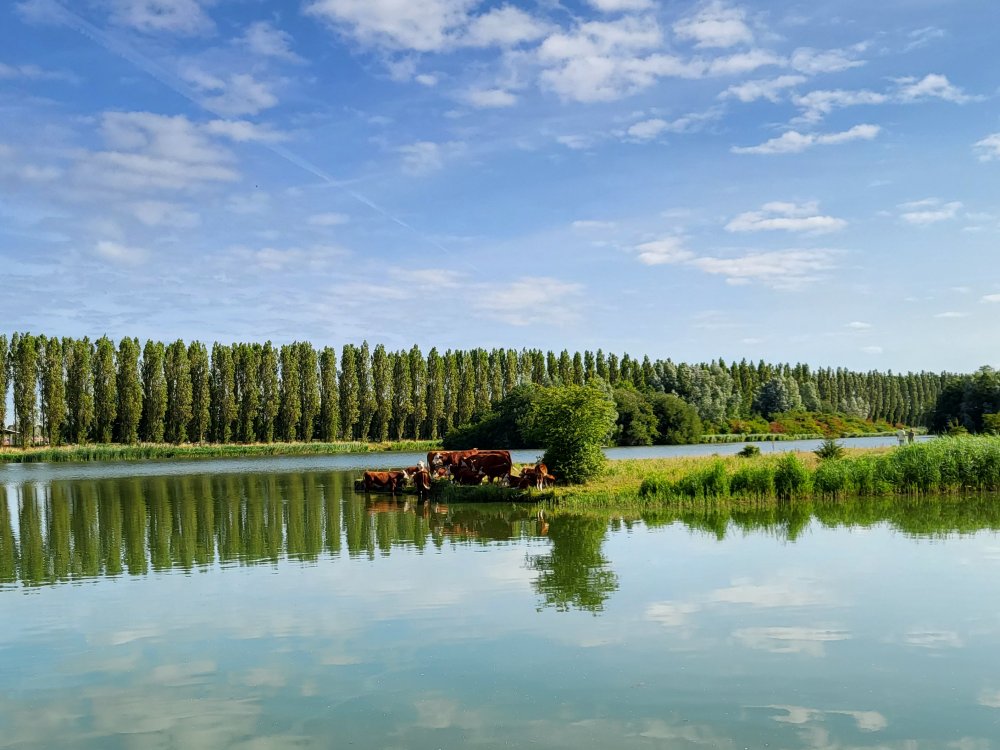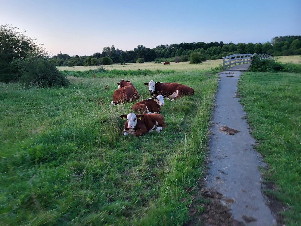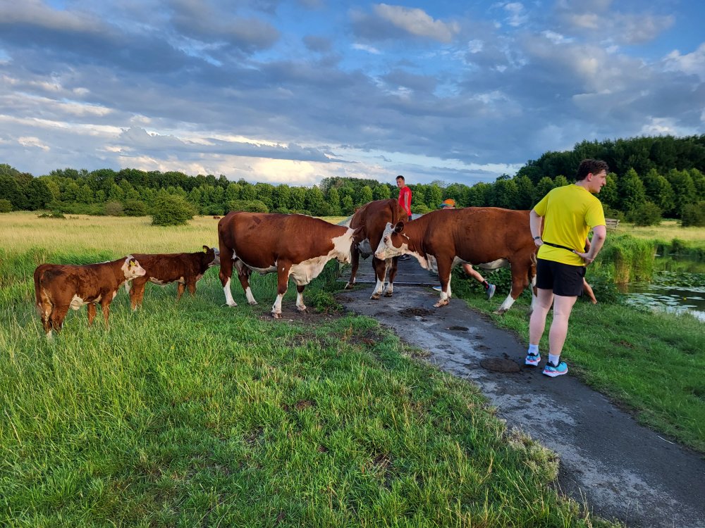 In Kardinge loopt een flinke kudde Hereford-koeien vrij rond. De beesten blokkeren een bruggetje in het Wijkpark. Eventjes is er geen doorkomen aan. De nieuwsgierige runderen zijn niet agressief, maar het blijft wel uitkijken als zo’n beest op je afkomt. De koeien besluiten toch maar aan de kant te gaan voor het groepje hardlopers. We kunnen weer verder.