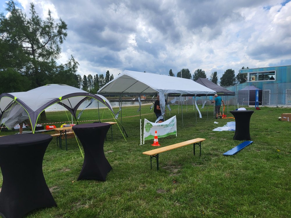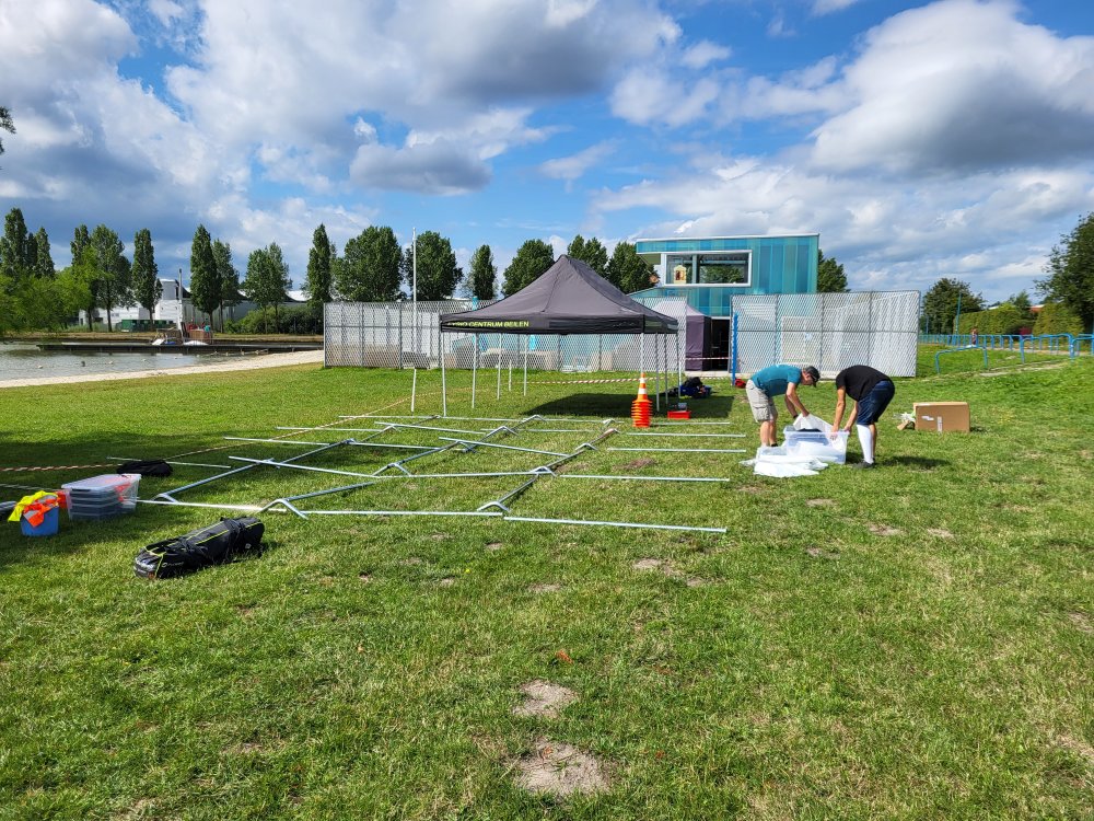 Voor mij begint de zaterdag al vroeg. Rond half tien fiets ik naar Kardinge om samen met Jan het startgebied af te zetten. Een half uur later is ook Tjerk van de partij en beginnen we met de opbouw van de eerste tenten. Rond half één arriveren meer hulptroepen voor de opbouw van het startterrein. Vanaf één uur zet ik samen met Elzo het parcours uit, want dat moet natuurlijk ook gebeuren.