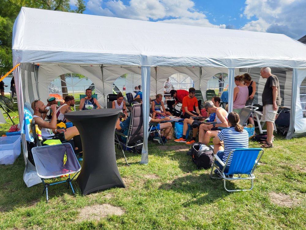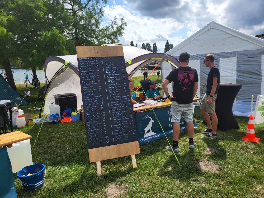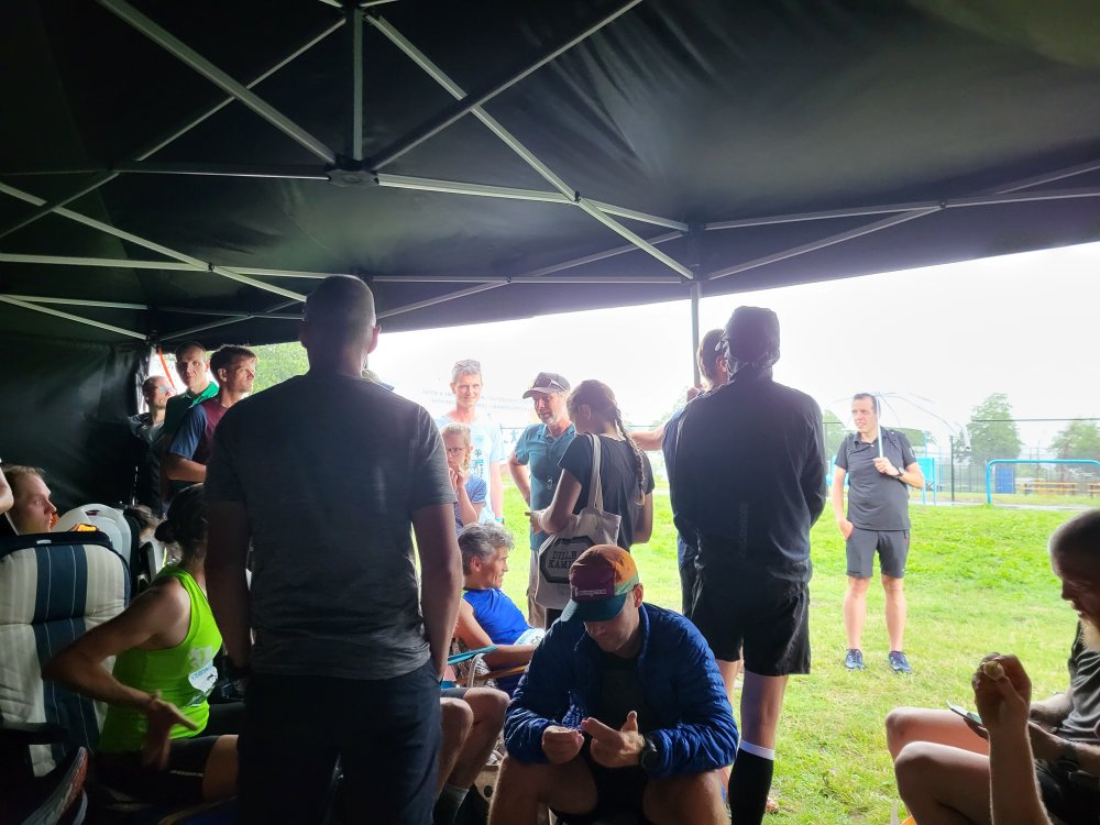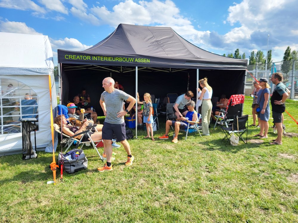 Na ons rondje kunnen we even uitrusten in de tent. Of even… toch al gauw een kwartier. Want terwijl ik dacht met de rem erop te lopen gaat mijn eerste ronde in 44 minuten. Voor mij is dat eigenlijk te snel. Ik moet dus langzamer lopen.