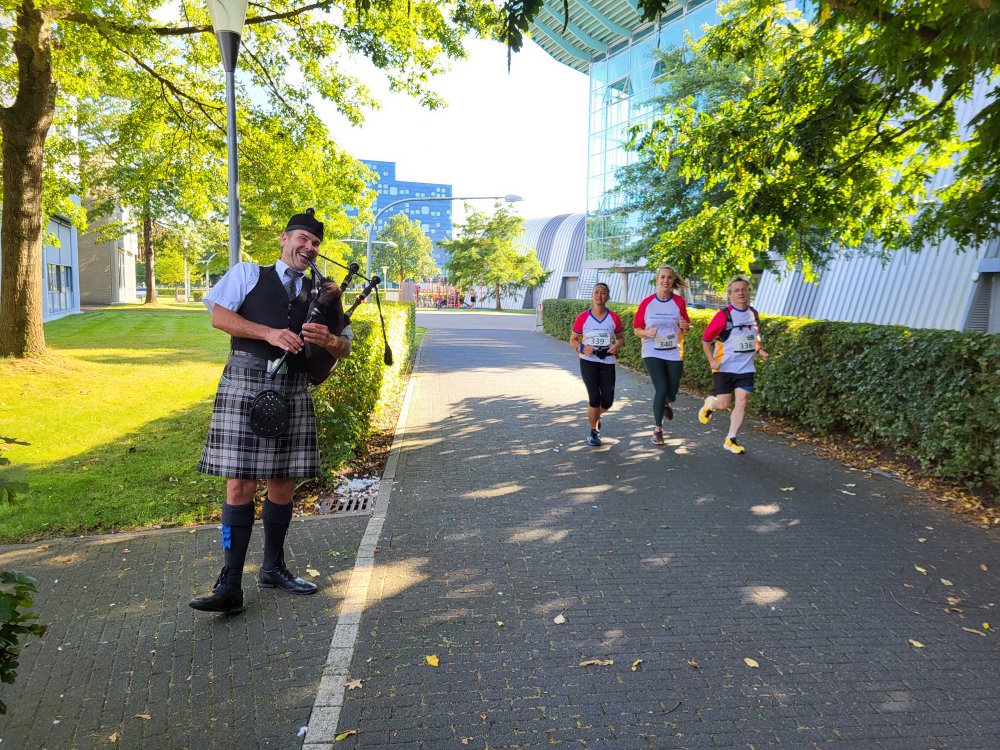 Begeleid door doedelzakklanken rennen we naar de kantine van de Marie Kamphuisborg. Iets verderop lopen we door naar de fraaie hal van de Energy Academy Europe, terwijl we ook de verlichte trappen in de Bernouilliborg meepakken. Eenmaal weer buiten steken we de Zernikelaan over en rennen een rondje door de Foodcourt.