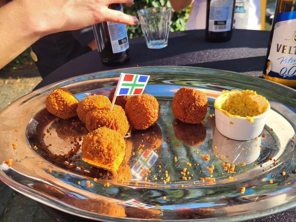 Uiteraard praten we uitgebreid na over deze leuke loop. Dat doen we bij Brasserie Zernike onder het genot van een (alcoholvrij) biertje. Na een tijdje verschijnen bruine fruitschalen met daarop eiwitballen. Een soort bitterballen, maar dan gemaakt van aardappeleiwit en dus vega(n). Best wel een smakelijk balletje. Hij mag nog wel ietsje kruidiger van mij, maar gelukkig is er mosterd. Een lekkere afsluiter van een leuk hardlooprondje langs en door de campusgebouwen. Tot volgend jaar maar weer!