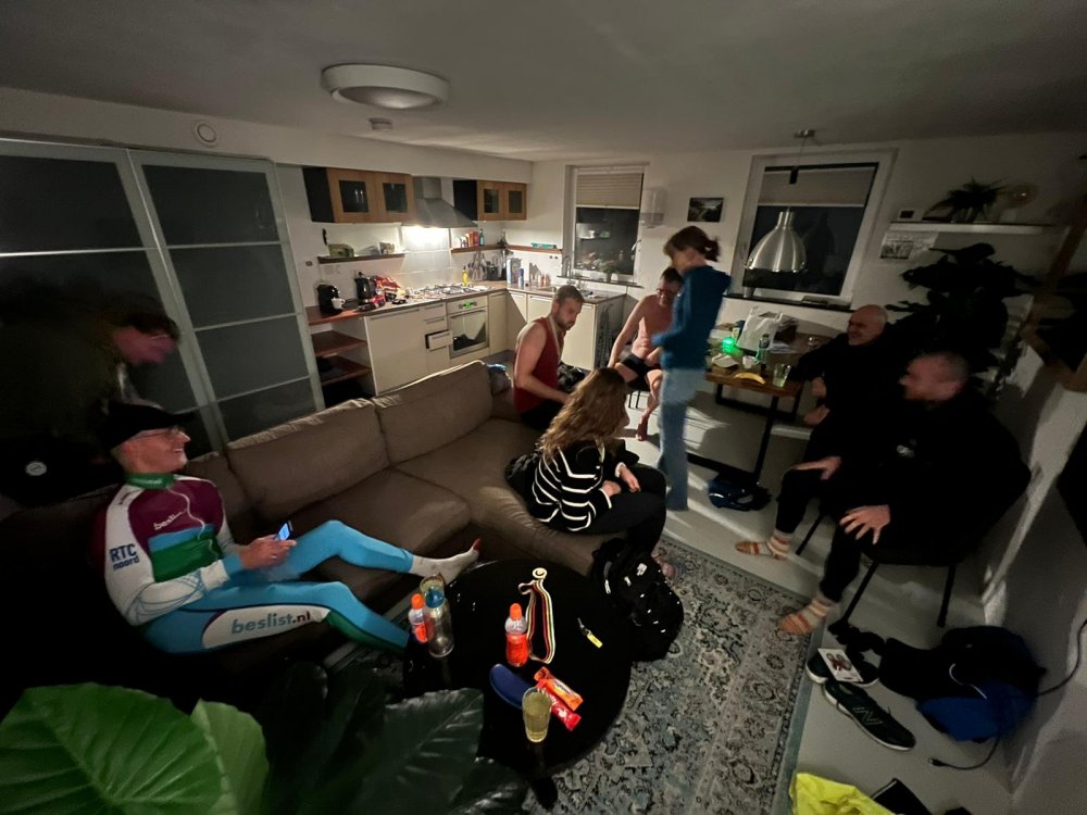 Voor de deur van het appartement maken we samen met René, Geert én de Brandaris een groepsfotootje en lopen naar het startvak.