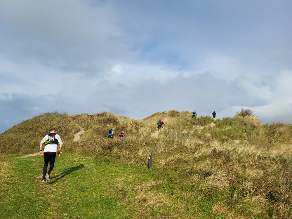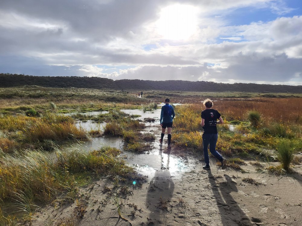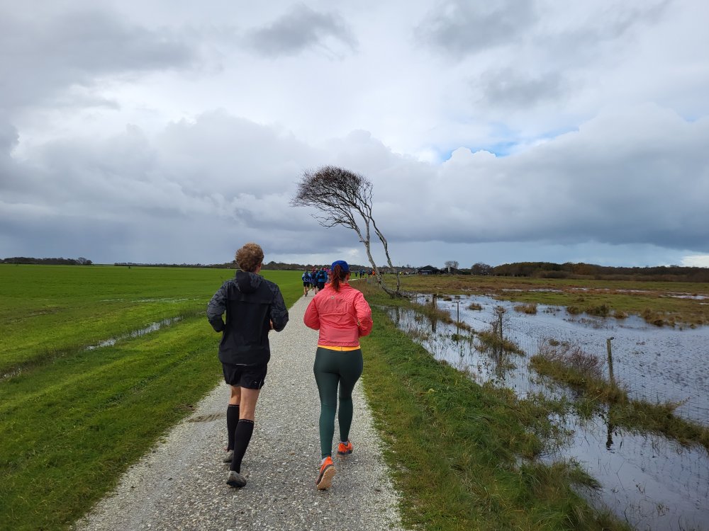 Inderdaad, net na Kaap Kobbeduinen krijgen een flinke regenbui over de kop. In een paar minuten zijn we doorweekt. Gelukkig is het niet ver meer naar de streep. Via het Kwelderpad en de Kooiduinen rennen we terug naar De Oorsprong.