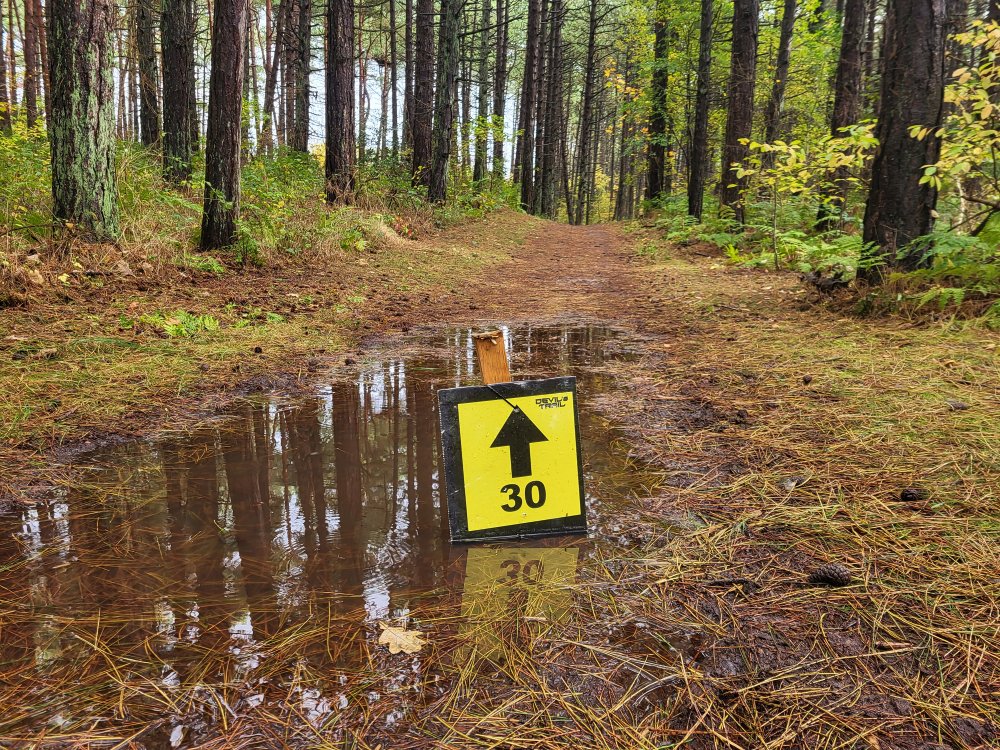 In de Eerste Dennen kronkelen we over smalle natte bospaadjes. Een prachtig en uitdagend deel van de route. De eerste plassen water proberen we nog te ontwijken, maar uiteindelijk lopen we er dwars doorheen.