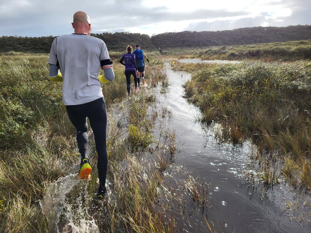 Bij Paal 8 verlaten we het strand en hoe! Achter de duinen ligt veel water en de route gaat er dwars doorheen. Sommige lopers proberen aanvankelijk nog om de plassen heen te lopen en droge voeten te houden. Leuk geprobeerd, maar helaas.