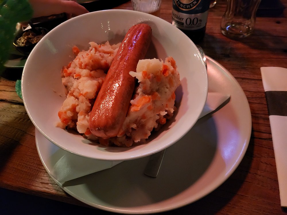 Eenmaal gedoucht en omgekleed is het alweer bijna tijd om Schier te verlaten, maar niet voordat we een hapje hebben gegeten bij de Tox Bar. Net als vorig jaar valt de keuze op de hutspot met rookworst. Als toetje volgt het Eilander Suikerbroodijs.