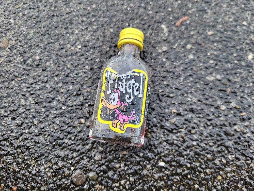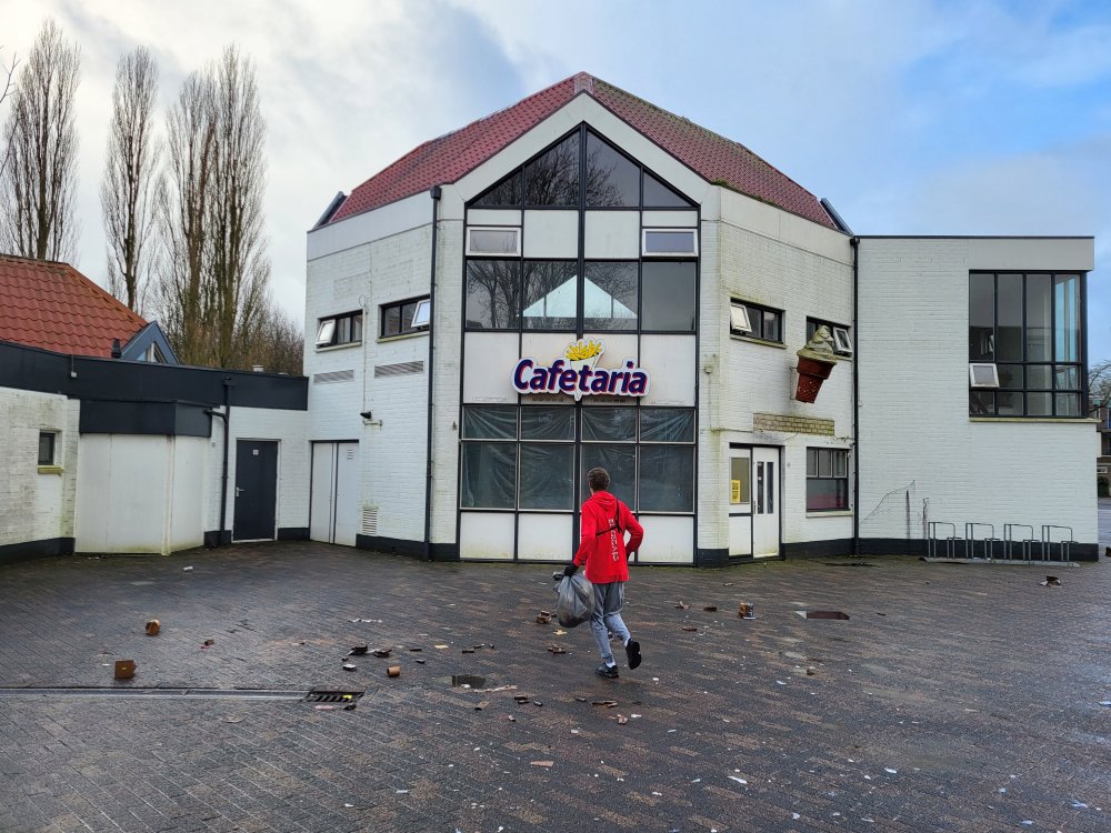 Richting het winkelcentrum komt het zonnetje er zowaar door. Het duurt niet lang, maar toch. Qua zooi op straat valt het gelukkig mee. Uiteraard vinden we her en der wel blikjes en andere drinkverpakkingen. Ook zien we flessen bubbelwijn en plastic champagneglazen.