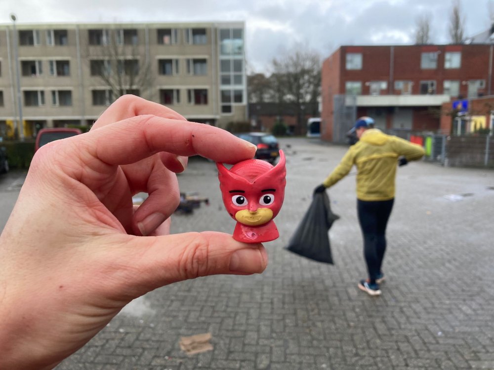 Verderop zien we een paar kleine brandhaarden, maar veel zijn dat er niet. Gelukkig is er weinig schade aan straten en bijbehorend meubilair. Tegen het einde van onze strooptocht vinden we nog wat grappige dingen, zoals poppetjes en hippe aanstekers. Met twee volle vuilniszakken sluiten we ons schoonmaakrondje af bij het huis van Bas.