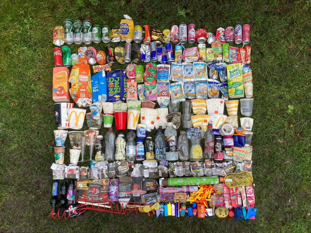 Zoals gebruikelijk stalt Bas de oogst uit op zijn gazon en maakt daarvan een foto voor zijn Instagram-account. In ongeveer anderhalf uur tijd haalden we twee zakken zooi van straat. Vorig jaar vonden we nog veel blikjes, maar dankzij de invoering van statiegeld zijn dat er inmiddels een stuk minder. Statiegeld werkt!