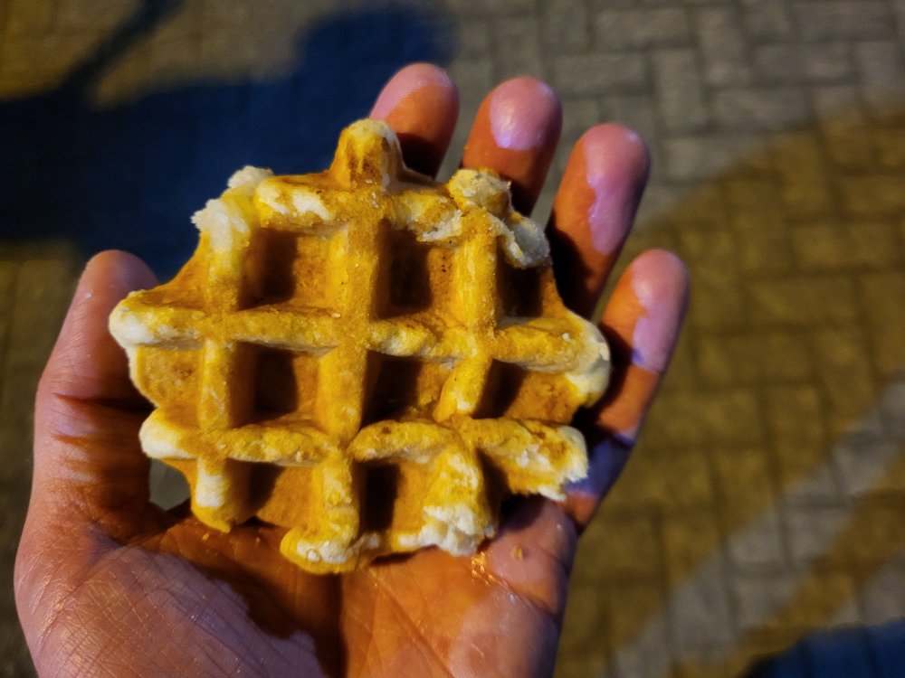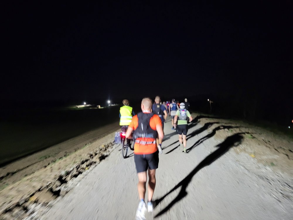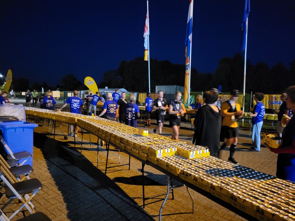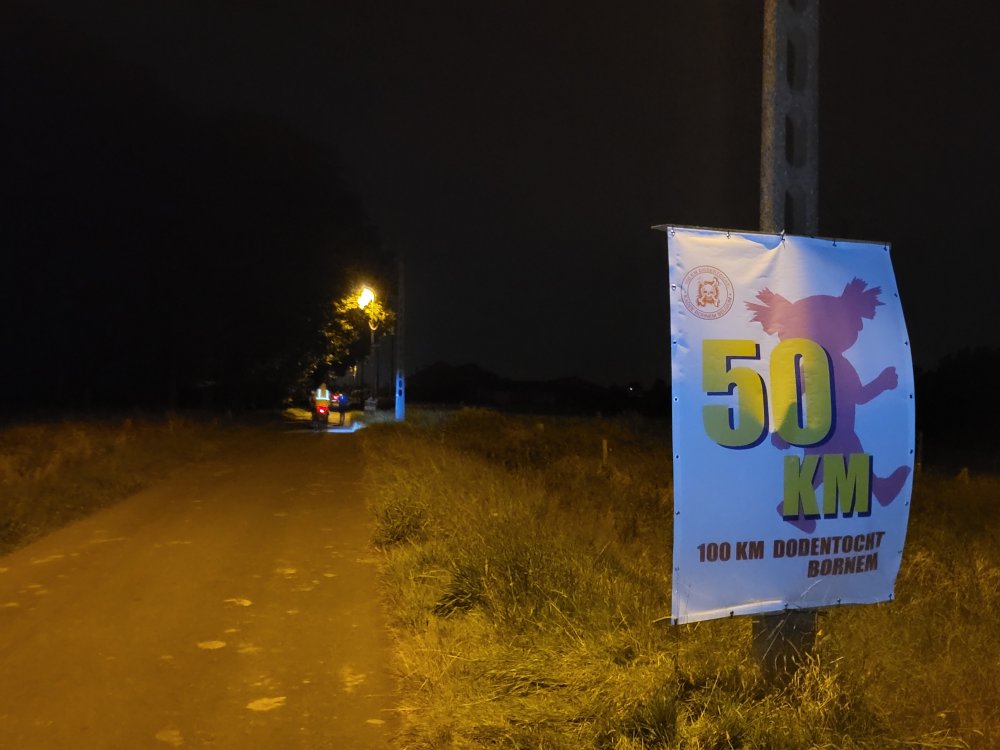 Na zo’n 13 kilometer bereiken we de eerste verzorgingspost op het terrein van Friesland Campina. Ik krijg een blikje Cécémel (De enige èchte) en pak een wafel, want we zijn natuurlijk wel in België. Inmiddels is het redelijk donker en pak ik mijn hoofdlamp erbij.