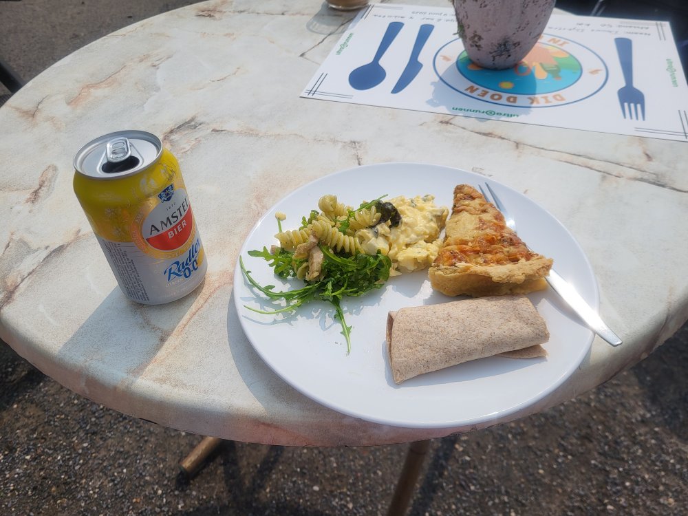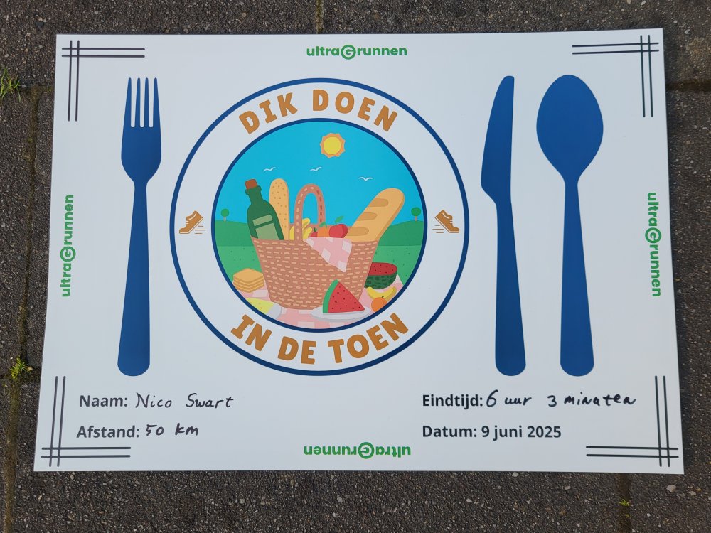 Gelukkig is het eetgedeelte nog lang niet ten einde. We gaan lekker Dik doen in de Toen. Op het terras genieten we van het eten en de live muziek. Als beloning is er voor iedere deelnemer een persoonlijke placemat. Mede daardoor zullen we nog lang terugdenken aan dit zeer gezellige loop- en eetavontuur. Deelnemers en vrijwilligers, bedankt voor een topdag!